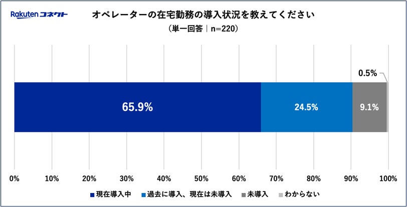 コンタクトセンターにおけるオペレーターの在宅勤務の導入状況を聞いたところ、65.9%が「現在導入中」、24.5%が「過去に導入していたが、現在は未導入」、9.1%が「未導入」と回答しました。