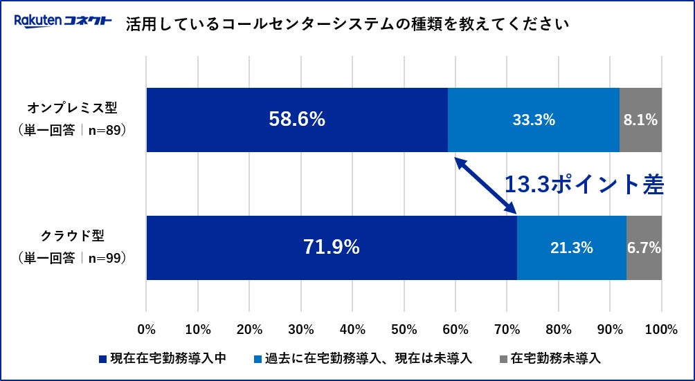 コールセンターシステムの種類別に在宅勤務の導入状況を見たところ、「オンプレミス型」では58.6%、「クラウド型」では71.9%と、「クラウド型」の方が現在在宅勤務を導入している割合が13.3ポイント高い結果となりました。