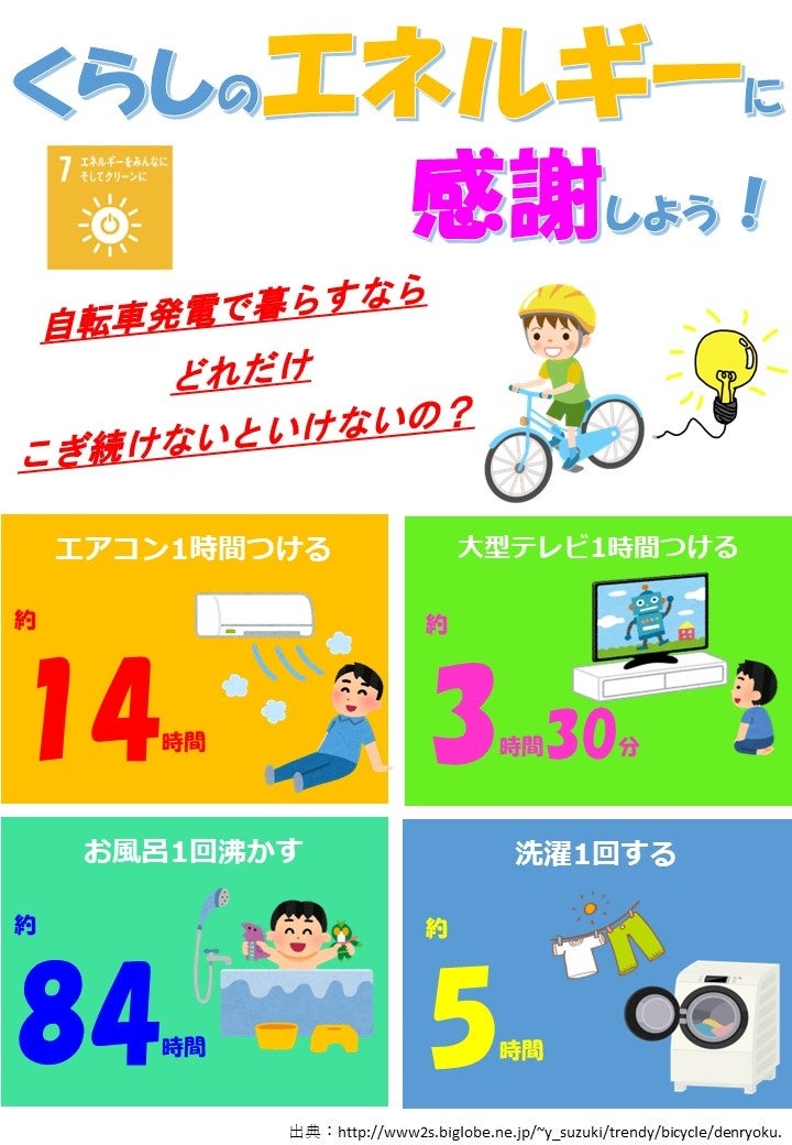 自転車発電装置で電気をつくり、家電製品を動かすのに必要な自転車をこぐ必要時間は下記の通りだ。
