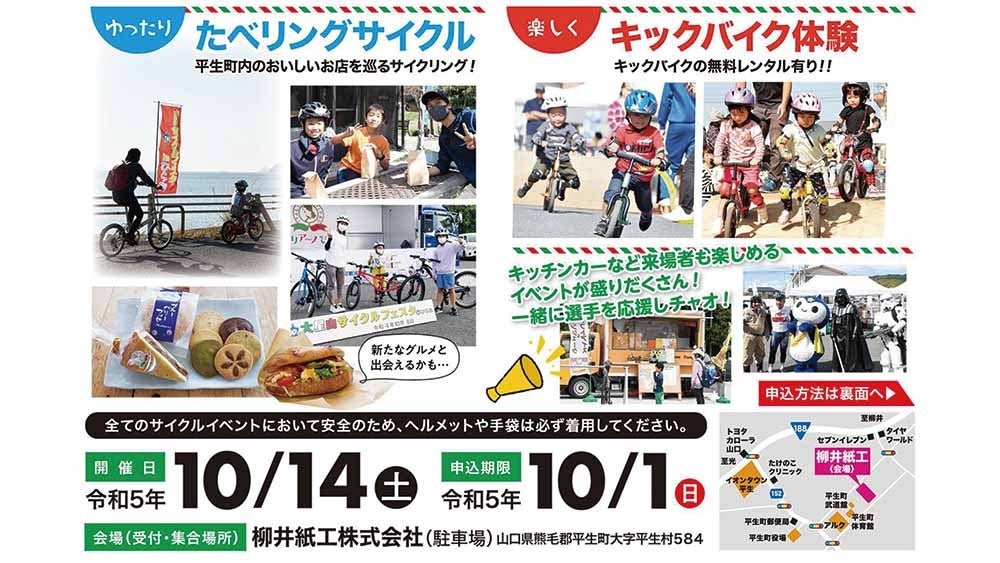 「たべリングサイクル」とは、平生町内のおいしいお店を巡るサイクリングだ。平生町の中心部や美しい海岸沿いを、ゆったりとサイクリングを楽しめる。小学生以上から参加可能ということで、親子で参加されるも方も多い。