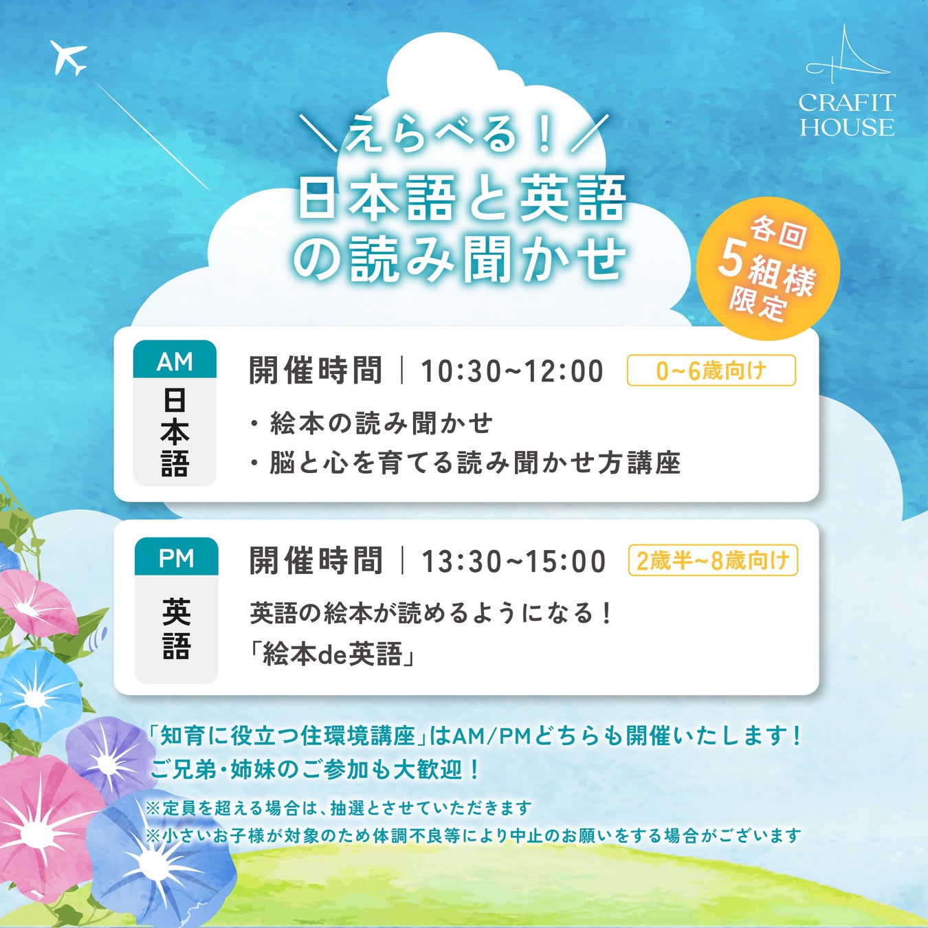 「知育に役立つ住環境講座」は、午前/午後どちらも開催いたします。