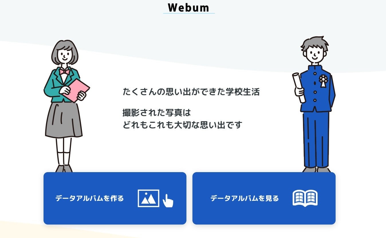 Webum(ウェーバム)システムは、従来の形の卒業アルバム(上製本)を継承しながら、スナップページの写真選定をWeb上で行うことができる卒業アルバム制作サービスです。
