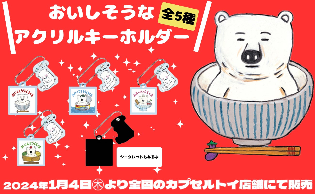 株式会社アイデア(本社:東京都中央区、代表取締役社長:井上宗則)は、柴田ケイコ先生作絵本『しろくまシリーズ』初のカプセルトイ、【おいしそうなアクリルキーホルダー】を1月4日(木)より、全国カプセルトイ店舗にて随時販売いたします。