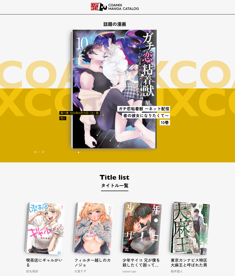 株式会社コアミックス(東京都武蔵野市)は、6月30日(金) にオフィシャルWebサイトをリニューアルいたしました。新たな機能としてコアミックス全作品の試し読み・購入ができる“マンガカタログ”を導入しました。そのほか、人気急上昇作品のランキング、今後の刊行予定一覧をトップページに追加し、より読者に寄り添ったWebサイトをオープンいたしました。