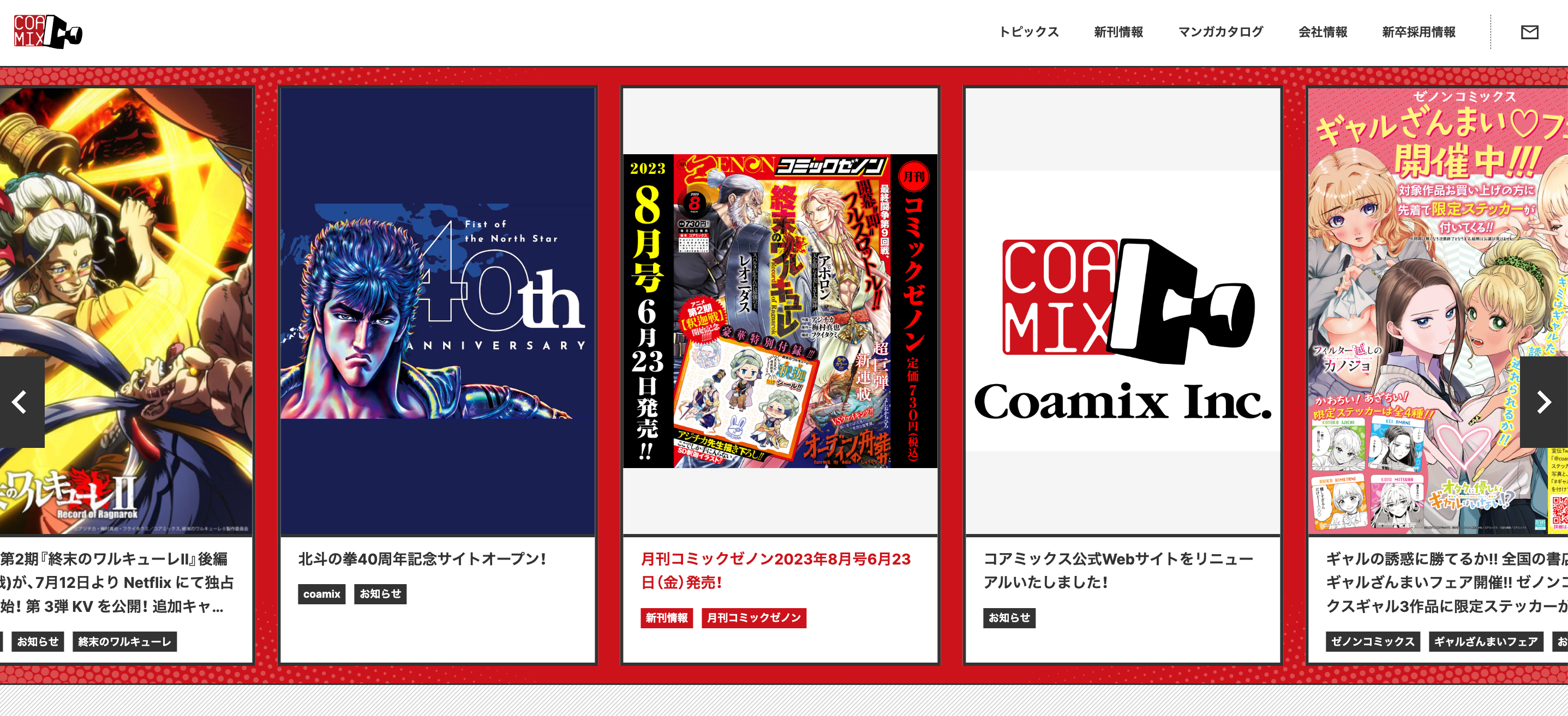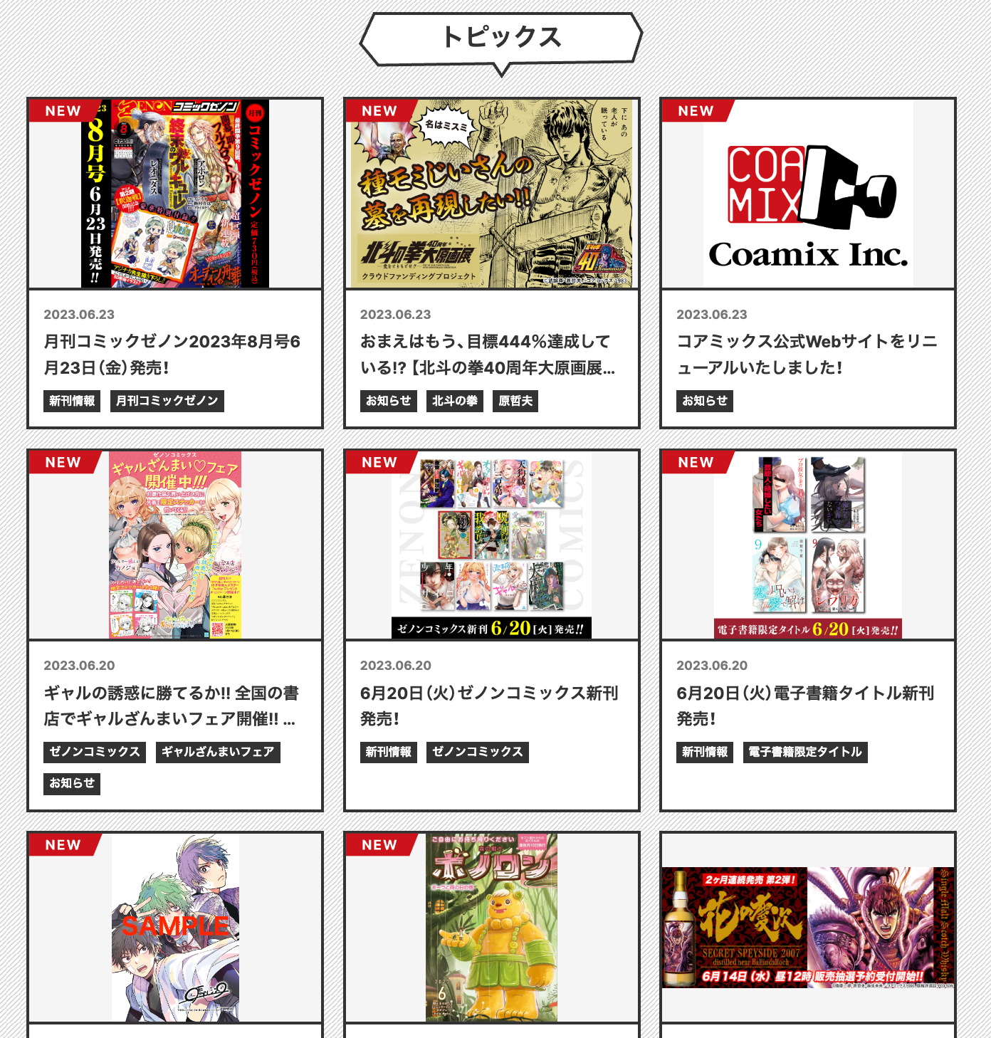 トップバナーでは、コアミックスやゼノンコミックスにまつわる新鮮なニュースをお届け!