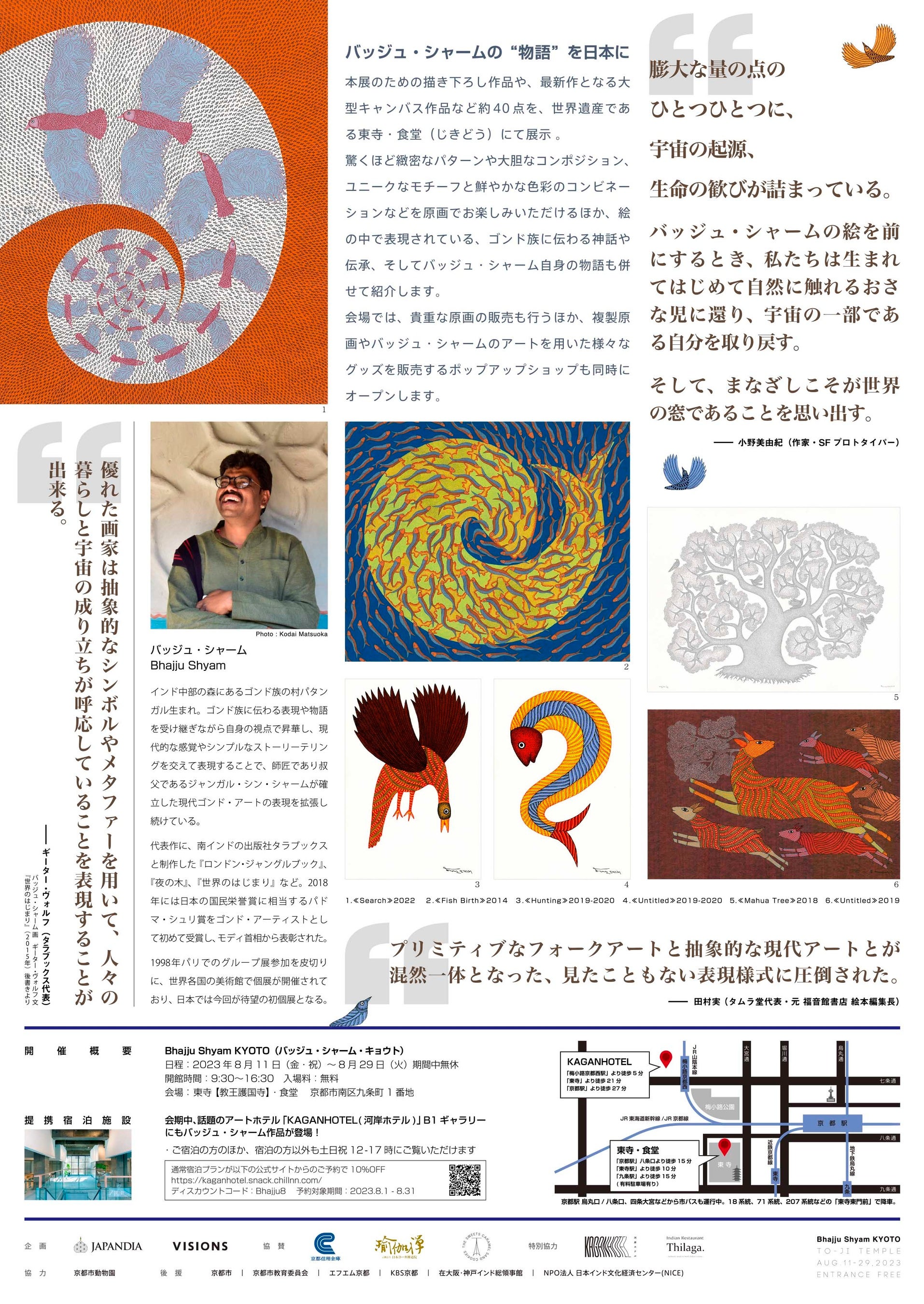 なお、本展の開催に伴い初来日を果たし、現在京都に滞在中のバッジュ・シャームは、アーティスト・イン・レジデンスにて新たな作品制作に着手しています。彼が京都の街や自然、そして人々の暮らしや伝統、文化から何を感じ、作品に昇華していくのか、注目が集まります。