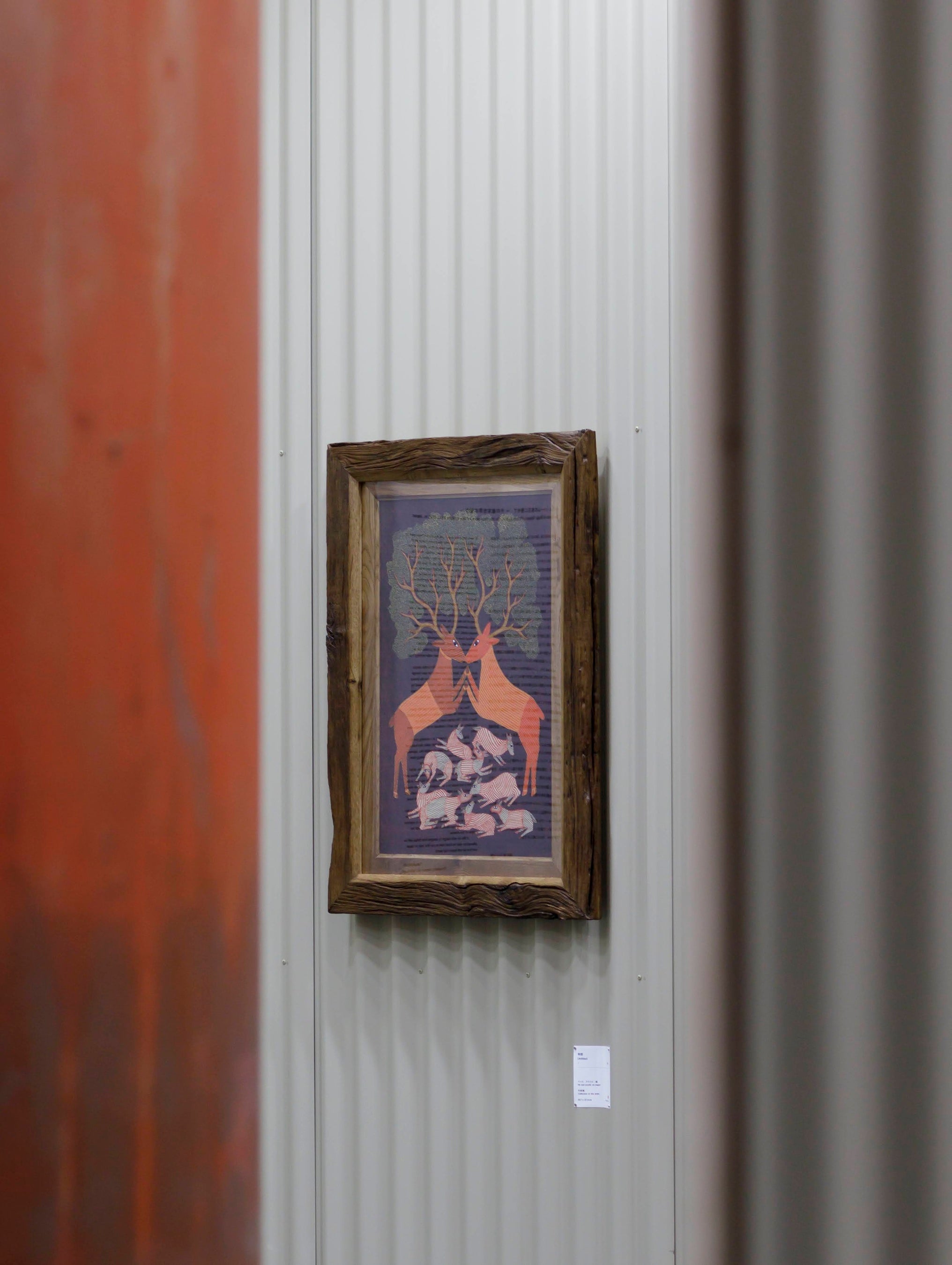 ゴンド族に伝わる表現や物語を受け継ぎながら⾃⾝の視点で昇華し、現代的な感覚やシンプルなストーリーテリングを交えて表現することで、師匠であり叔⽗であるジャンガル・シン・シャームが確⽴した現代ゴンド・アートの表現を拡張し続けている。