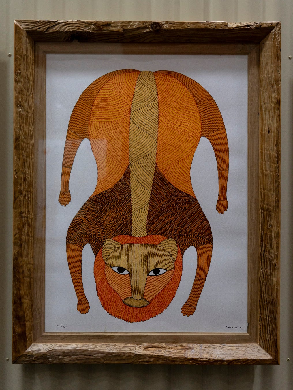 「トライバル・アート」(部族のアート)などというと、「ほっこり系?」なんて思われそうですが、バッジュ・シャームの場合は〈絵画〉として見ても相当面白いんです。たとえばメインビジュアルともなっているライオンの絵。全体の形はほぼ左右対称です。普通それだと、静的な感じになります。でも、彼の場合は違う。背中の肩のあたりを見てください。肩の部分の模様はほぼ左右対称です。それに対して、肩甲骨のあたりは違う。非・対称になっていて、しかも、そこを満たしている模様がゆるやかなうねりを生みだしている。これだけでも結構すごいと思うのですが、それ以上に見逃してほしくないのが、背中を縦に貫く細長いパート。その内側の模様は黒の線で描かれています。それに対して、パート自体を象る線(上下方向の線)は赤なのです。とーーーーっても繊細な処理がなされていて、そんな細部に及ぶ配慮の結果に、ライオンのかわいさが生まれている。絵画って、そういうものなんです。他にも、髪の毛を媒介にして女性と動物とが自然に一体化している作品があったりと、とにかく巧みな絵画が連続するのが今回の展覧会。実物を見ないと気づけないところも多々あるので、この機会をどうぞお見逃しなく!