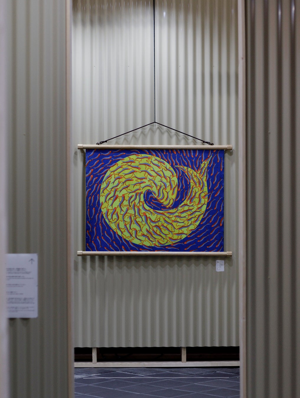 全体として、森羅万象や人、動物の日常を扱っています。その中でも会場正面に展示している「探索(Search)」という作品は、ゴンド族に伝わる創世物語を描いています。神の遣いとして、大きな鳥たちは水に覆われた地球上で陸を探すように命じられ、旋回しながら飛翔しています。また、キャンバスの全面を覆うように描かれた膨大な量のハチ達は、新たな陸へと蜜(新たな生命の種)を運んでいる様子を表しています。