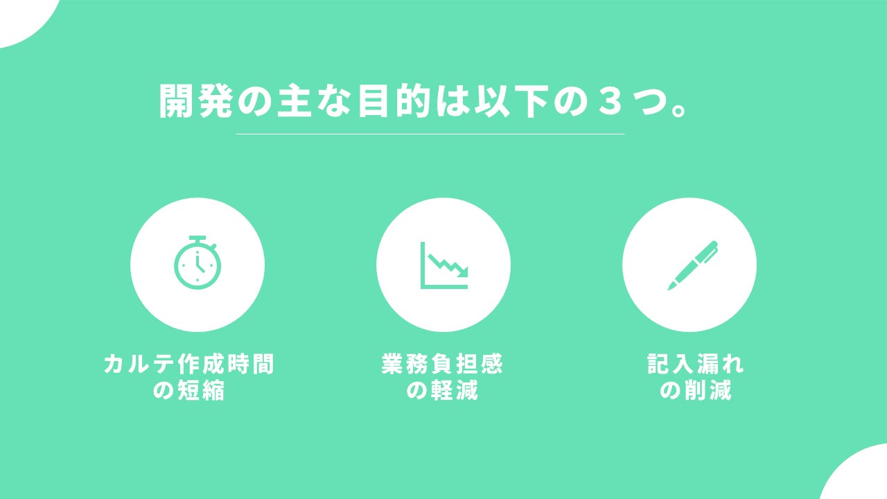 医療現場では、医療従事者が患者さまへの治療以外にも、診療録や書類作成に多くの時間を割いています。この業務負担は、新型コロナウイルス対策(例えば家族面会のオンライン化)、診療報酬の改訂、院内環境のデジタル化などによって、ますます増加傾向にあると言えます。特に、リハビリテーションの現場では、患者さまとのコミュニケーション時間が長くて情報量が多いこと、筋力トレーニングや歩行介助などで手を使うために記録が難しいことにより、診療録作成に多くの時間がかかっていました。また、診療録やその他の書類作成に、以前よりも更なる慎重さと正確さが求められているのが現状です。