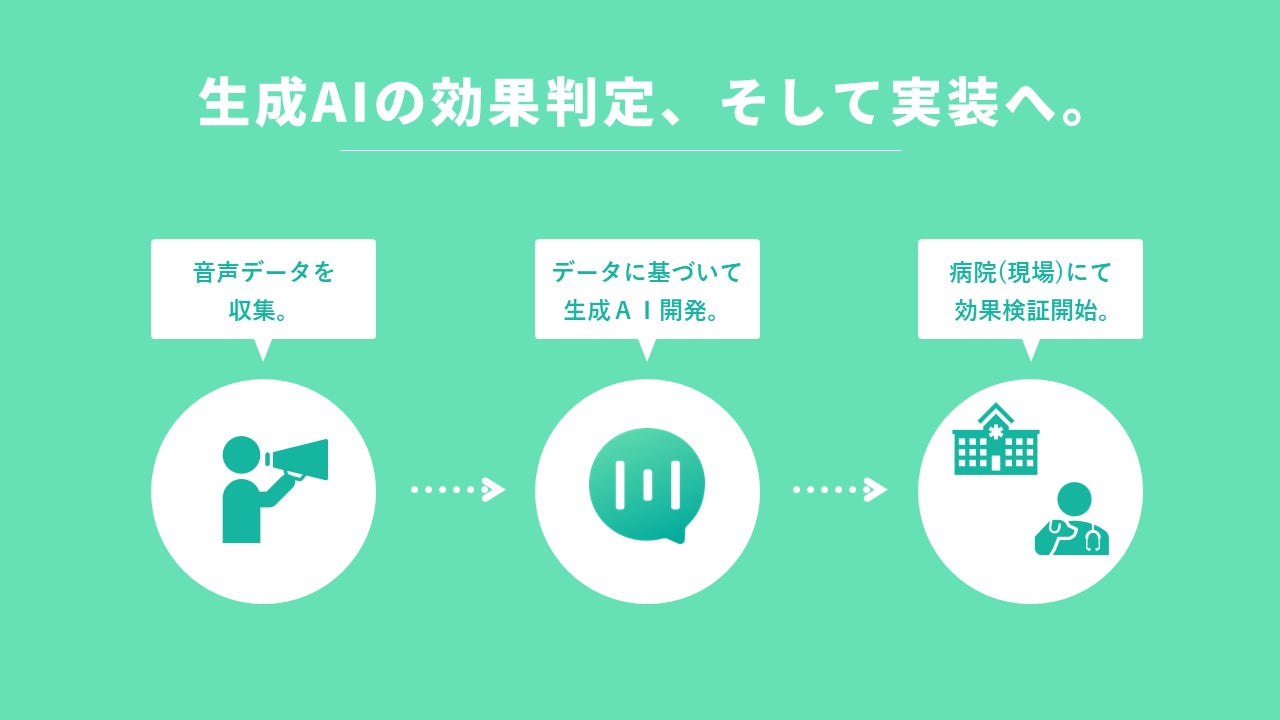 こうした背景から、生和会グループでは診療録作成の効率化を目指し、具体的な解決策を模索してきました。そこで、既にクリニックの外来診療現場向けにβ版リリースされている診療音声からカルテ原稿を自動作成するAIツール「medimo」が目に留まり、このたびリハビリテーション分野に特化した生成AIモデル開発が開始されました。