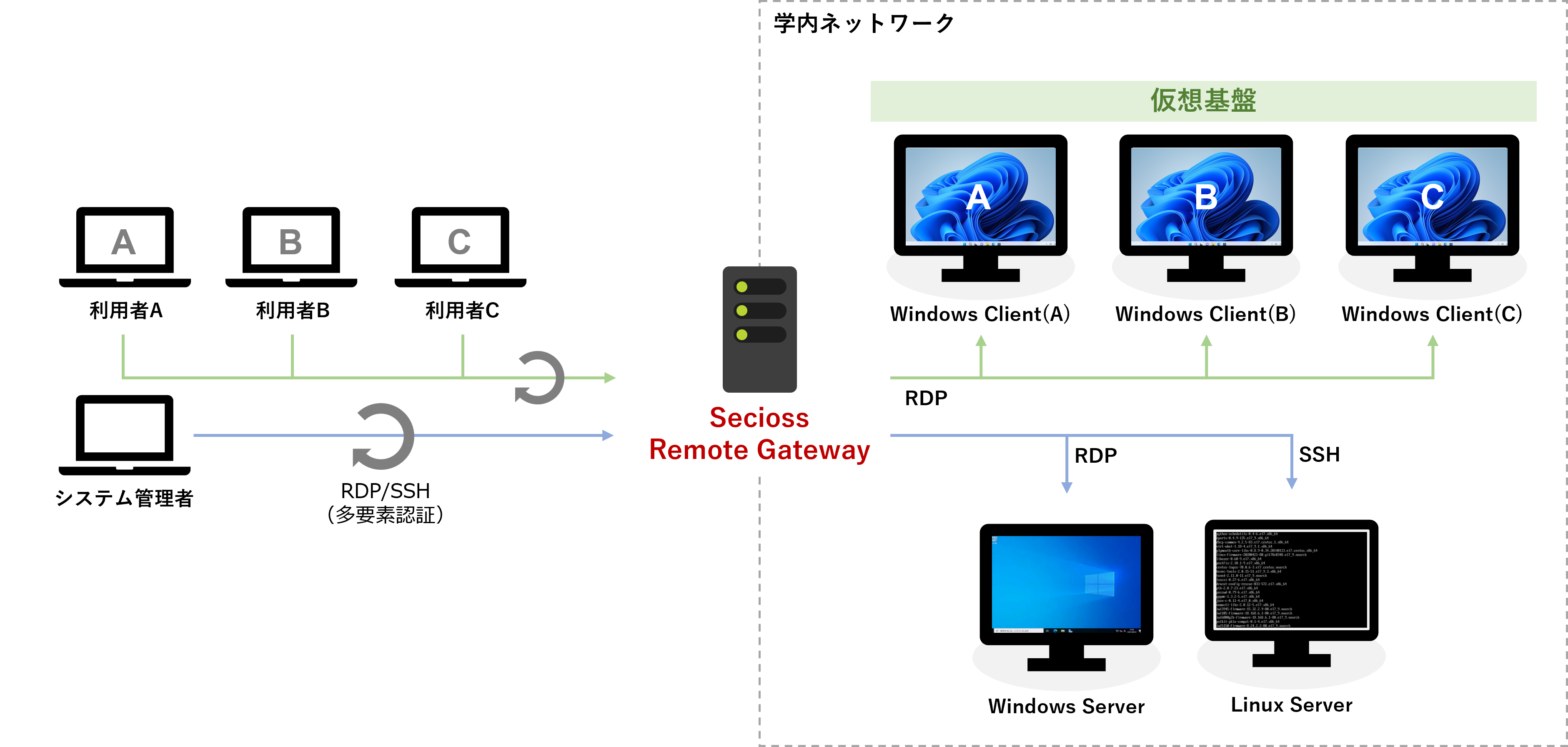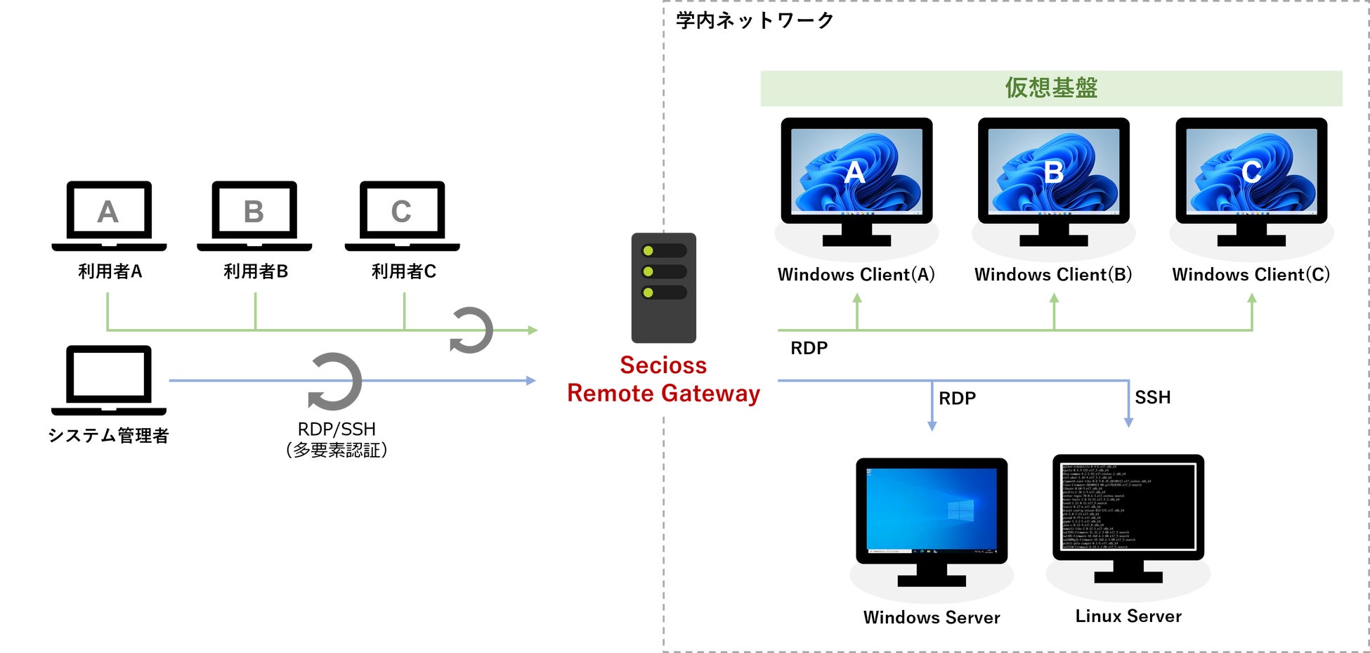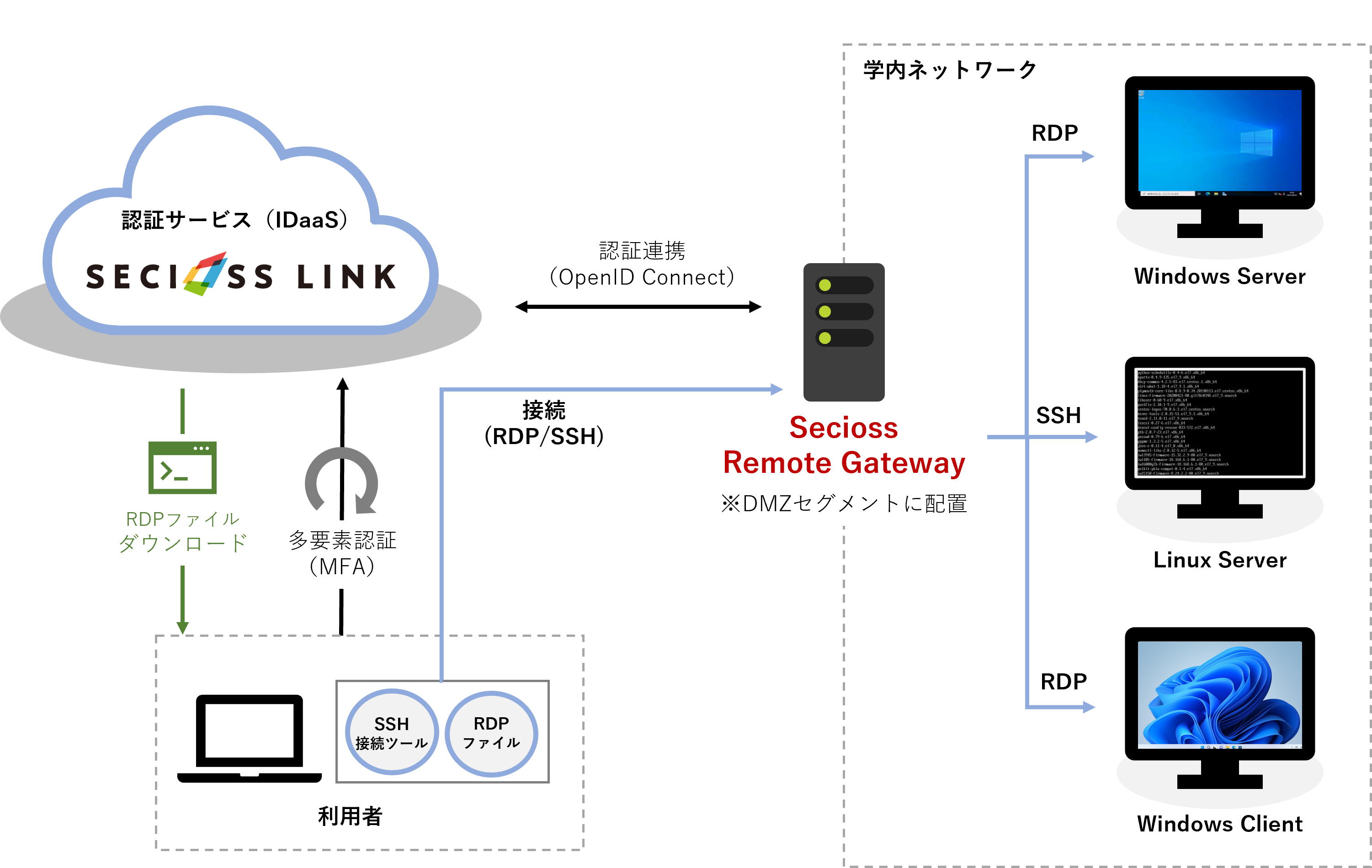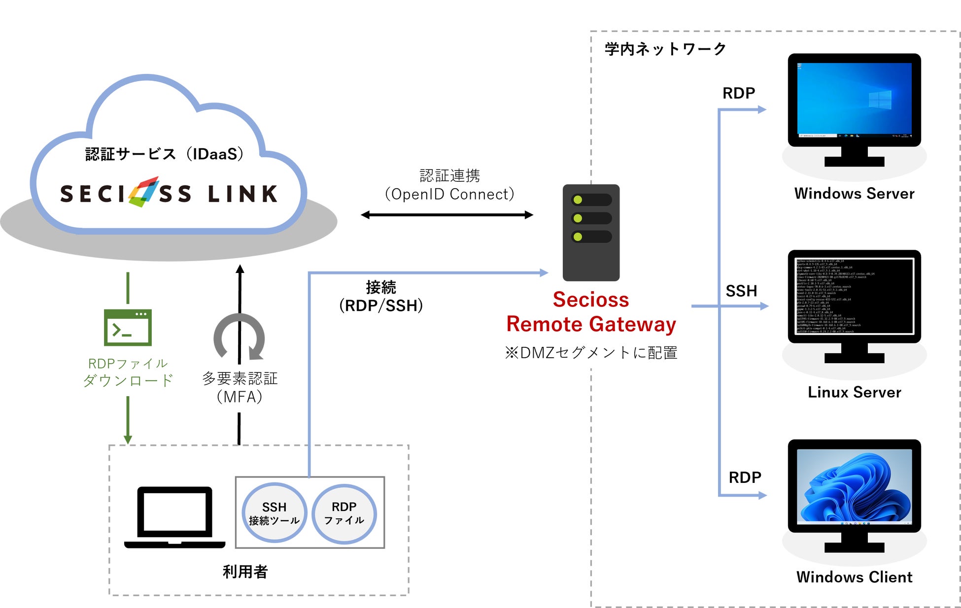 Secioss Remote Gatewayは、これまで遠隔地から学内ネットワークにアクセスするため必要だったVPNを使わずにリモートアクセスを実現するソフトウェアです。VPNとは異なり、ユーザーはポリシーベースのアクセス制御機能によって接続先サーバーにのみアクセスが許可されます。また認証時にワンタイムパスワード(OTP)やFIDO認証を利用することでセキュリティを高めることができます。
