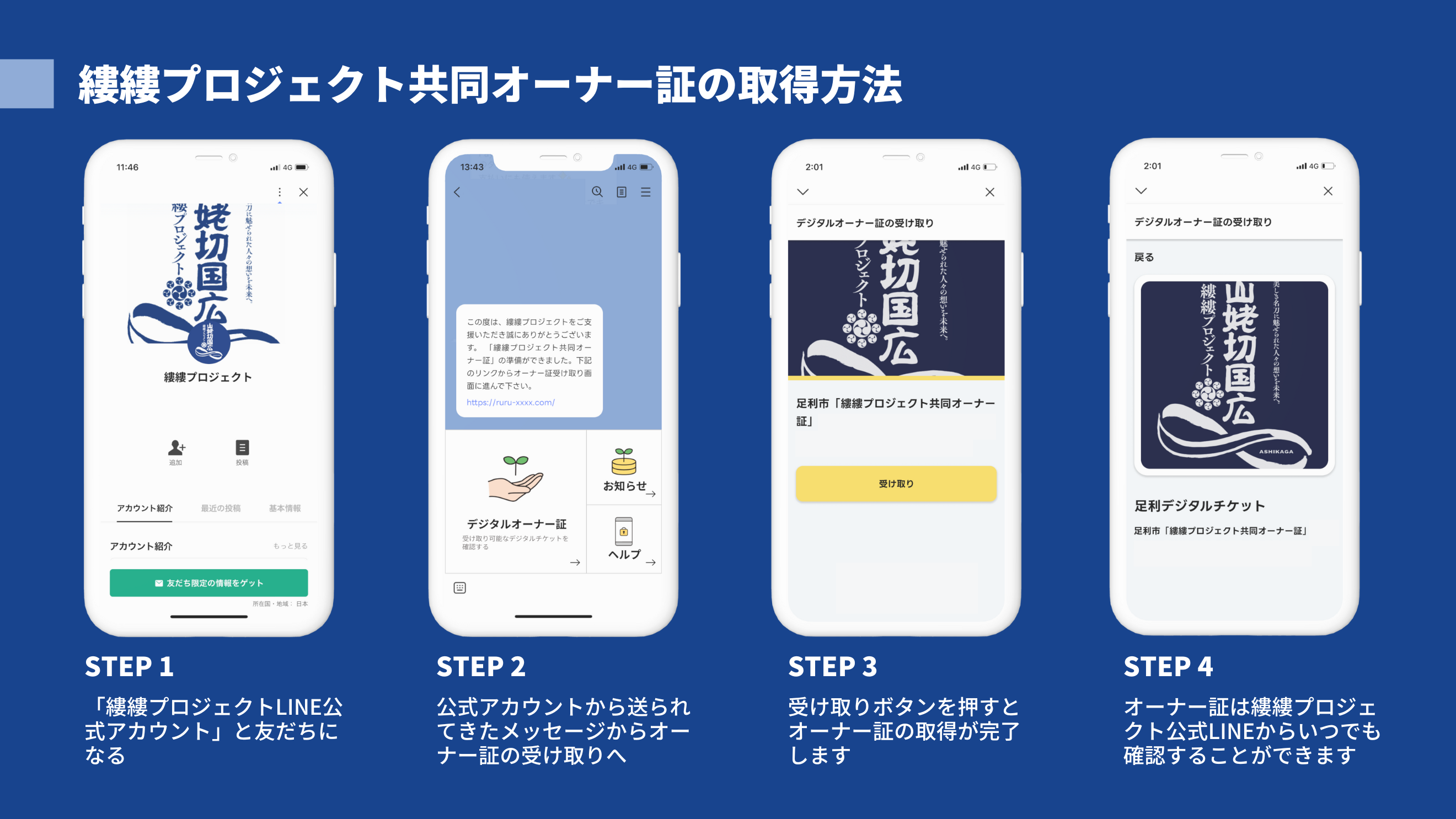 寄附はクラウドファンディングとふるさと納税を利用して行われます。クラウドファンディングの寄附者には「縷縷プロジェクト共同オーナー証」を提供し、これはNFT技術を使用して偽造や不正利用を防止する狙いがあります。共同オーナー証はLINEアプリで受け取りができ、保有していることで様々な特典が得られます。詳細な特典や申し込みは以下特設サイトで確認可能です。