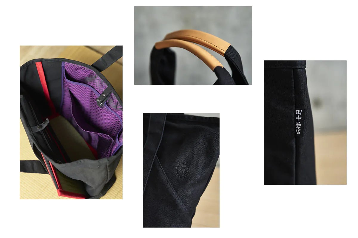 畳バッグがトートバッグの前面に収納されており、畳をアクセントとして見せます。畳バッグは取り外して使うこともできます。トートバッグの持ち手及び畳バッグのハンドルにはヌメ革を使用しており、使えば使うほど味が出ます。トートバッグ内にはPCケースがあり機能的な作りとなっています。トートバッグ内底にも畳を使用しています。カジュアルに普段使いとして、また旅のお供に重宝するデザインとなっています。