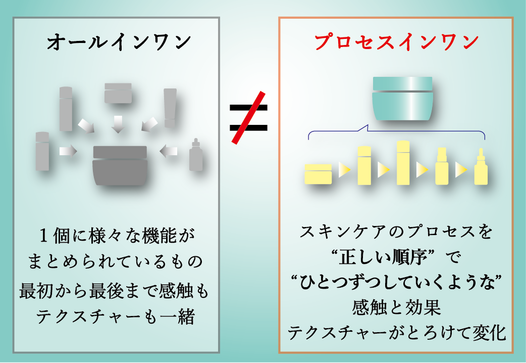 オールインワン化粧品はひとつに様々な機能がまとめられているもので、テクスチャーも使用感も初めから最後まで変わりません。「プロセスインワンメルティクリーム」は1個でスキンケアのプロセスをひとつずつしていくような感触と実感が得られるので、まるで丁寧なスキンケアにおけるライン使いをしているかのような感覚を得られます。