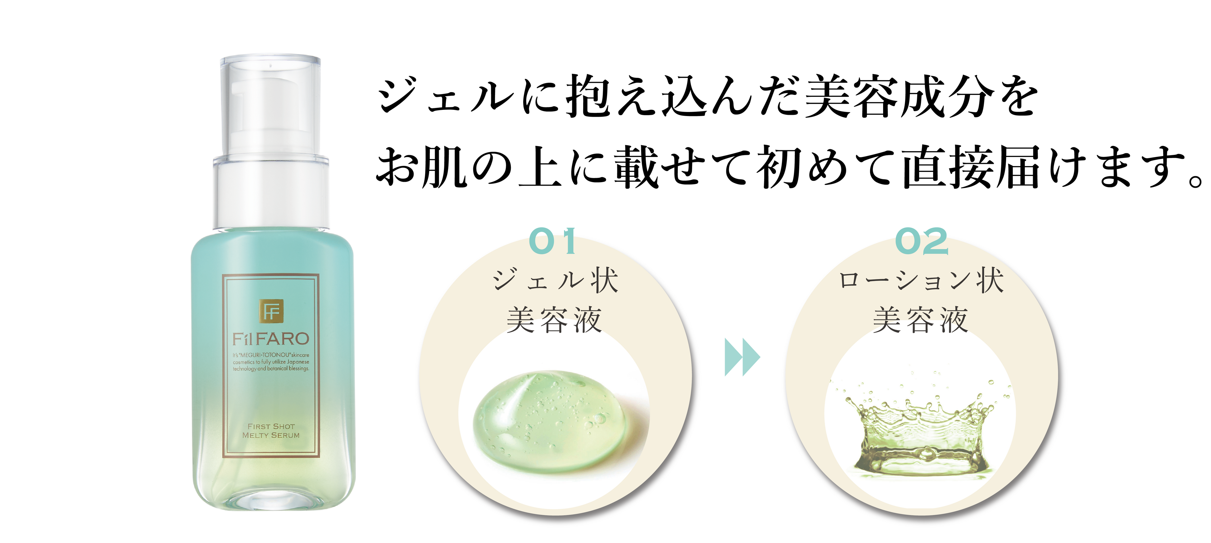 「ファーストショットメルティセラム」は洗いあがりの無防備なお肌を瞬時に整えて、土台を安定させます。
