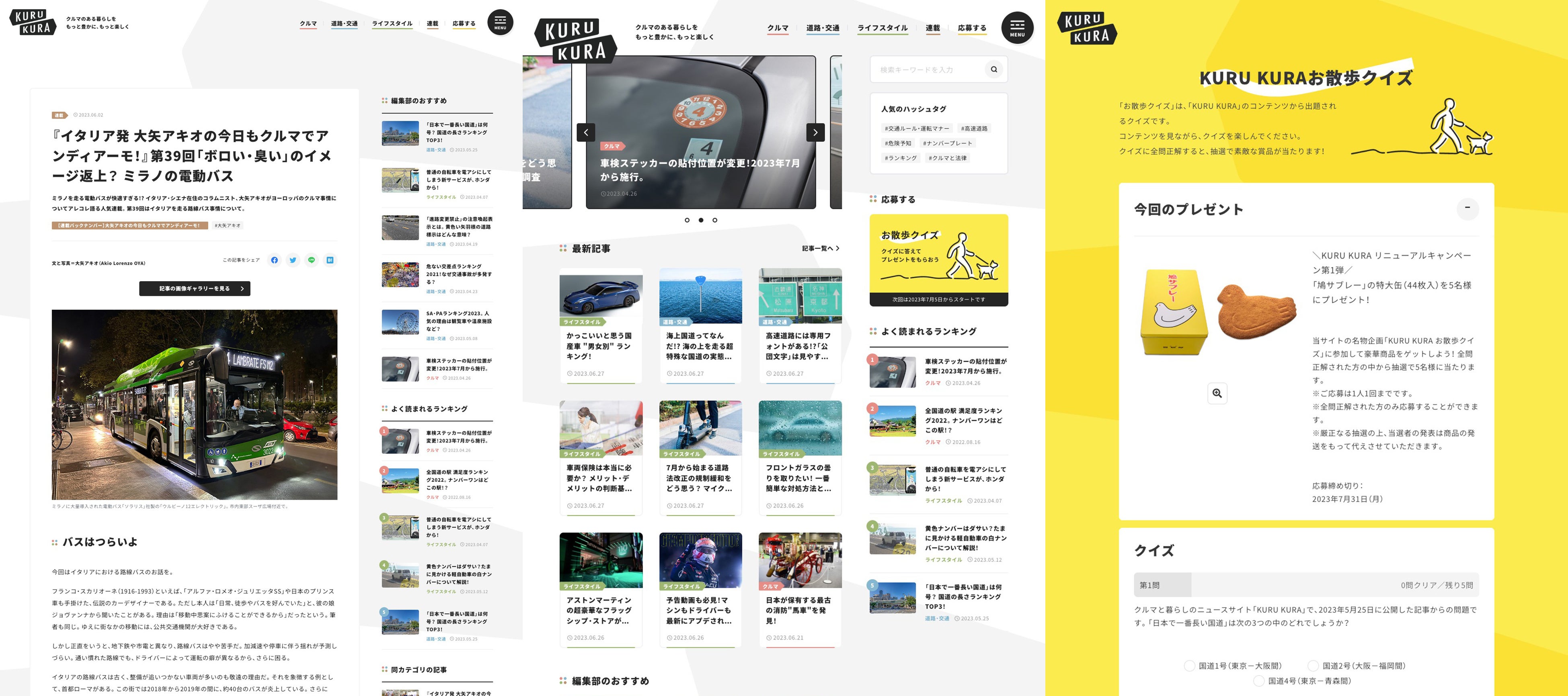 最新ニュースから、テクノロジー、カルチャー、そしてエンターテインメントまで、暮らしに役立つ幅広い分野の情報をお届けするKURU KURA。今回のリニューアルでは、記事カテゴリーを《クルマ》《道路・交通》《ライフスタイル》《連載》の4つに再編。読者が知りたい情報をすぐ見つけられるよう、レイアウトデザインも一新しました。