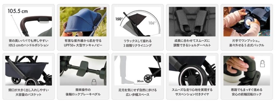 押しやすく歩きやすい、高めのハンドルポジションと広い歩幅スペース。赤ちゃんの乗り心地を考えた広いバックレストシートと振動吸収のサスペンション搭載タイヤなど、随所に人間工学(エルゴノミックデザイン)設計が生かされた、押す人と乗る人に優しい1台です。