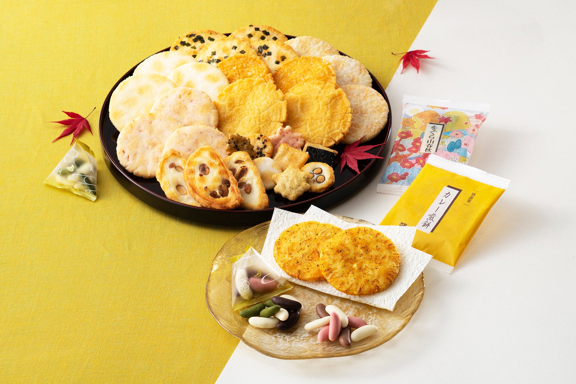 小倉山荘の代表菓『をぐら山春秋』をはじめ、創業の一品『嵯峨乃焼』などバラエティ豊かな11種28袋をお詰めしました。柿の種にチョコをコーティングした『想ひそめし』や、感謝祭でしか出会えない『カレー煎餅』などが一度に楽しめるのも、この秋の『お福分け』だけ。