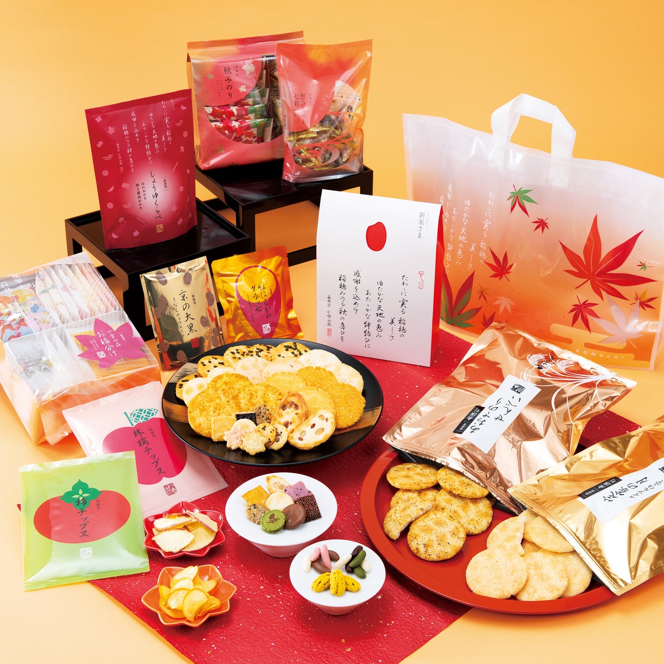 小倉山荘 各店舗にて10月18日(水)より順次始まるこの度のイベントでは「ゆたかな秋のみのりに、あたたかな絆に、感謝」をコンセプトに、今年収穫した新米や果物をつかった旬の味覚を楽しめる商品や、定番人気のおせんべいを集めた感謝祭だけの詰め合わせなどをご用意しております。