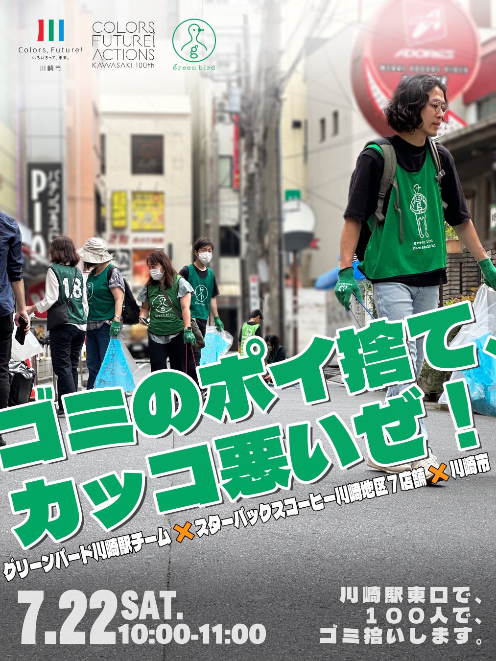 きれいなまち「かわさき」を未来の人たちにつなぎ、次の100年に向けて「あたらしい川崎」を生み出していくために、100人で一斉に、川崎駅周辺のクリーンアップを行います。今回、川崎駅周辺及び構内に7店舗を構え、日頃から持続可能な社会の実現に積極的なスターバックスコーヒーから、地域活動に関する取組の提案を受け、川崎駅周辺でゴミ拾いボランティア活動を行うグリーンバード・川崎駅チームと連携して、ごみ拾いイベントを開催することとしました。さらに、川崎市で実証実験中のスマートフォンアプリ「Green Carb0n Club」とも連携。イベント参加でポイントが貯まります。このイベントを通じて、日々の身近なクリーンアップ活動の促進につなげていき、川崎市の都市イメージ向上を図ってまいります。