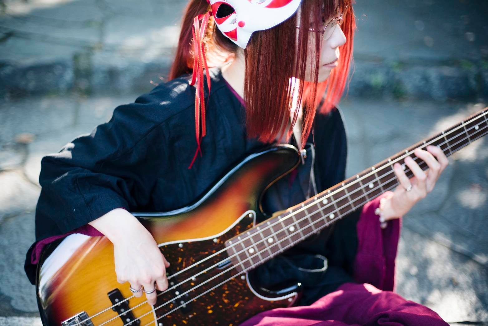 赤い髪に狐面を着け、ゆらゆら揺れながら奏でるベーシスト。