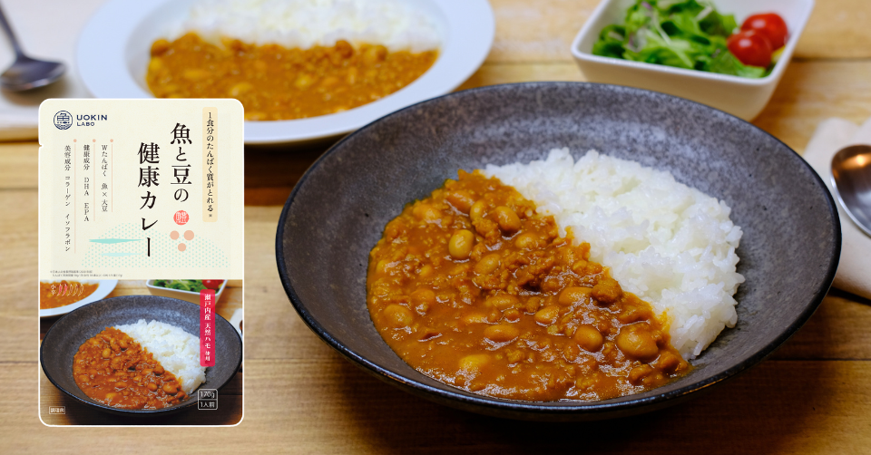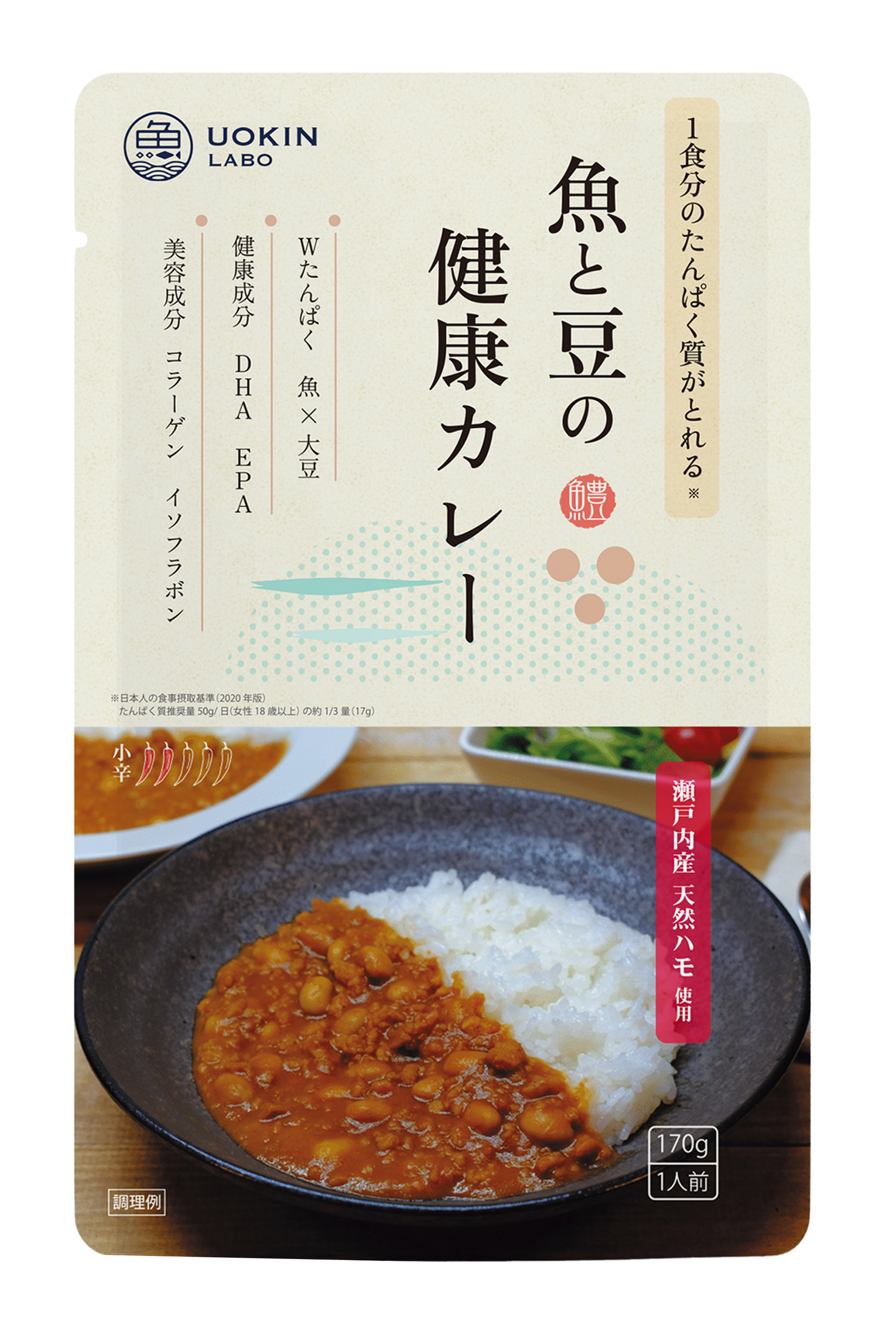 魚の栄養素を活用したフィットネス・健康食品ブランド「UOKIN LABO」(運営:ストーク株式会社/所在地:兵庫県豊岡市/代表:濱名 栄作)は、1食分のたんぱく質※1をはじめ、DHA・EPAや食物繊維、コラーゲン、イソフラボンなど、カラダづくり・健康づくりに役立つ栄養素を美味しく、手軽に摂れる「魚と豆の健康カレー」を、5月7日に新発売します。