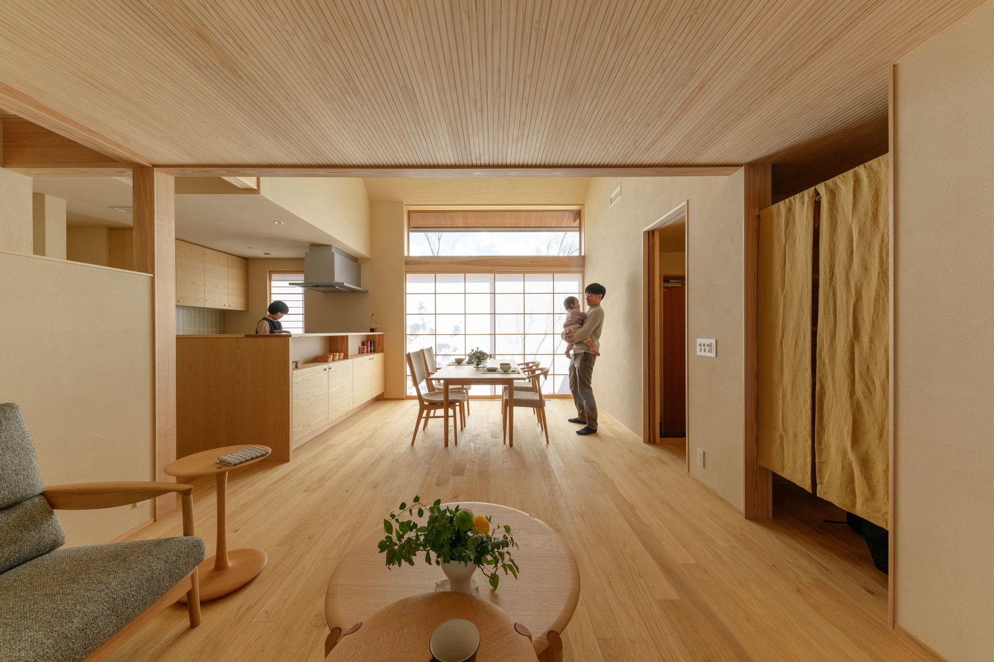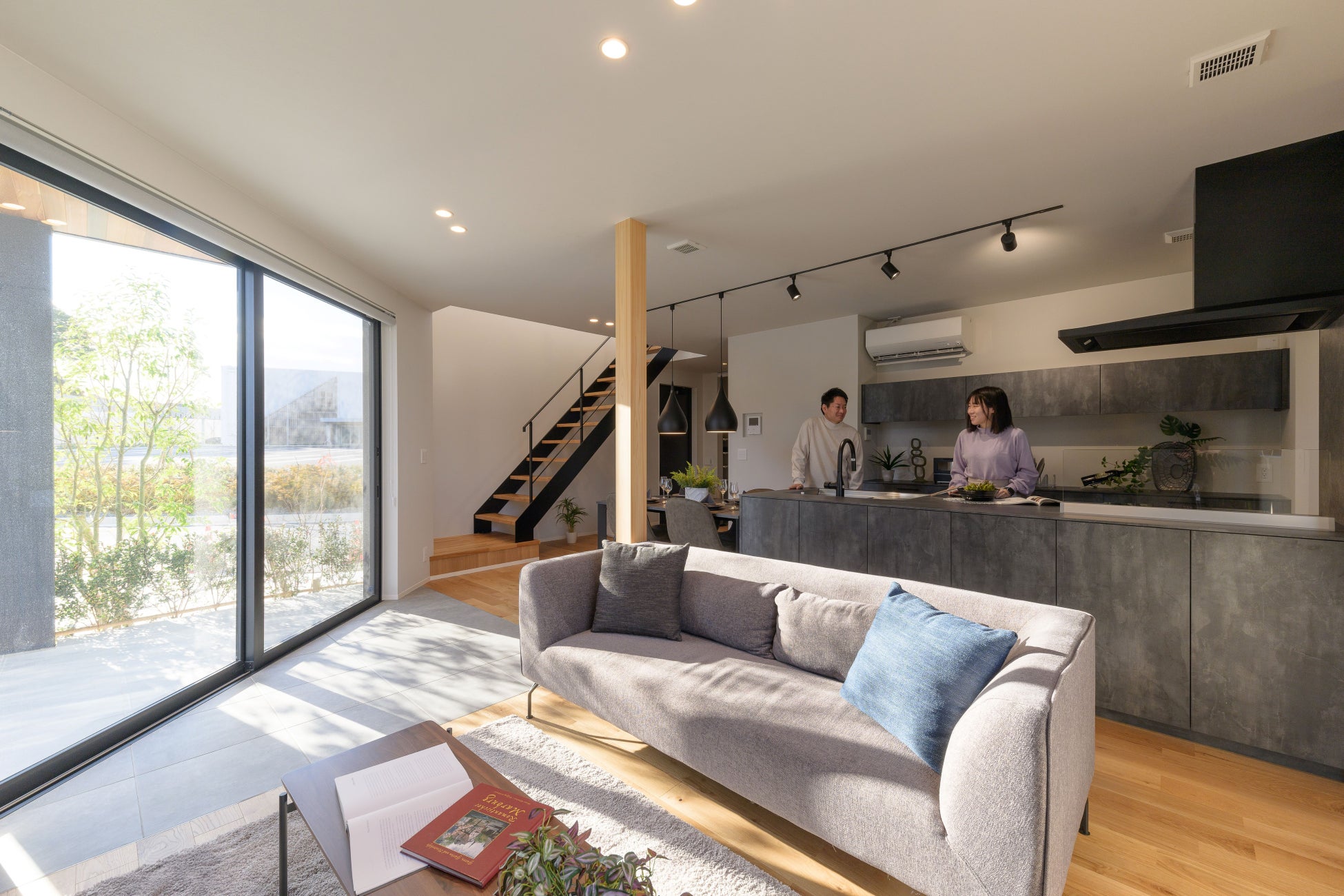 『自然豊かな安岡の地で四季の美しさを感じ心も体も健康になる家』をコンセプトに、家族同士の気配を感じ安心感や一体感のある家のカタチとしました。床には音響熟成木材の杉、壁には幻の漆喰を用いて自然素材の持つ、やわらかくあたたかみのある素材を仕上げ材とし、一日の疲れを癒してくれる家です。