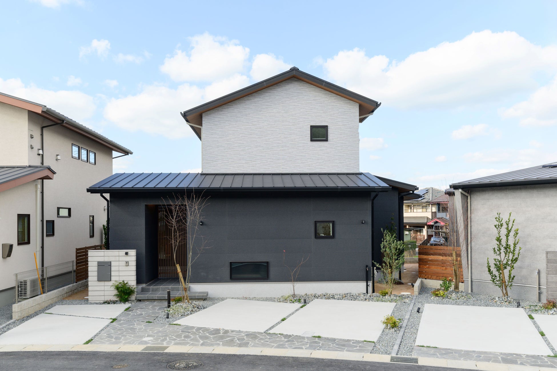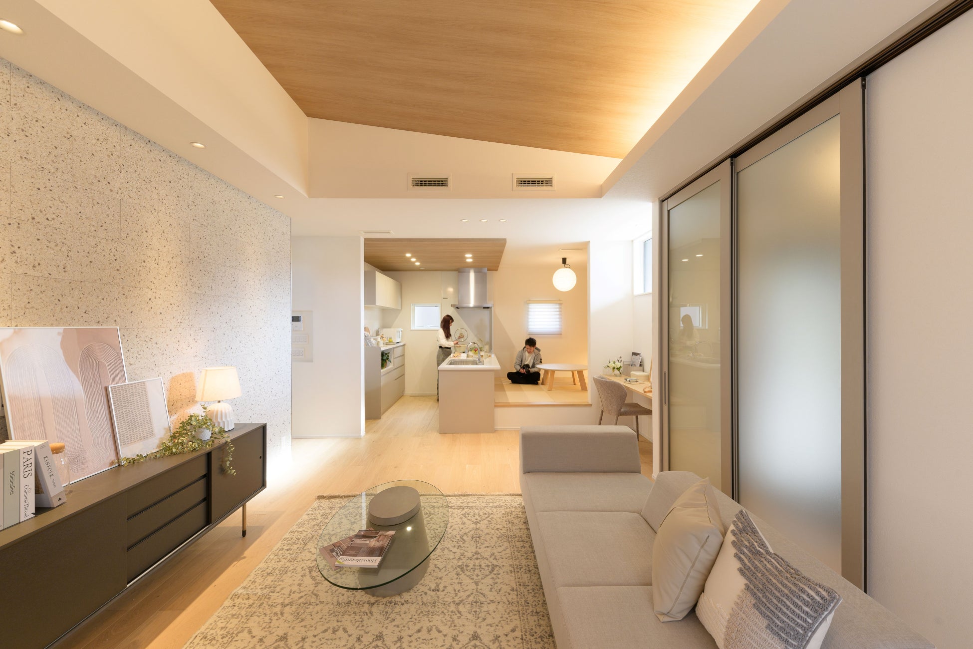水平ラインが伸びる切妻の屋根は一見平屋のように見えますが、中に入ると大きな吹き抜けが開放感を与える2階建てならではの空間になっています。吹き抜けを介してLDKとつながる和室は家族の気配を感じながらも自分の時間を過ごすことができます。また、将来のことも考えて大容量の収納やWEB会議でも活躍する書斎も用意しました。さらに、外に目をやればBBQや子供の遊び場など、アイデア次第で多目的に使えるタイルデッキも生活の幅を広げてくれます。