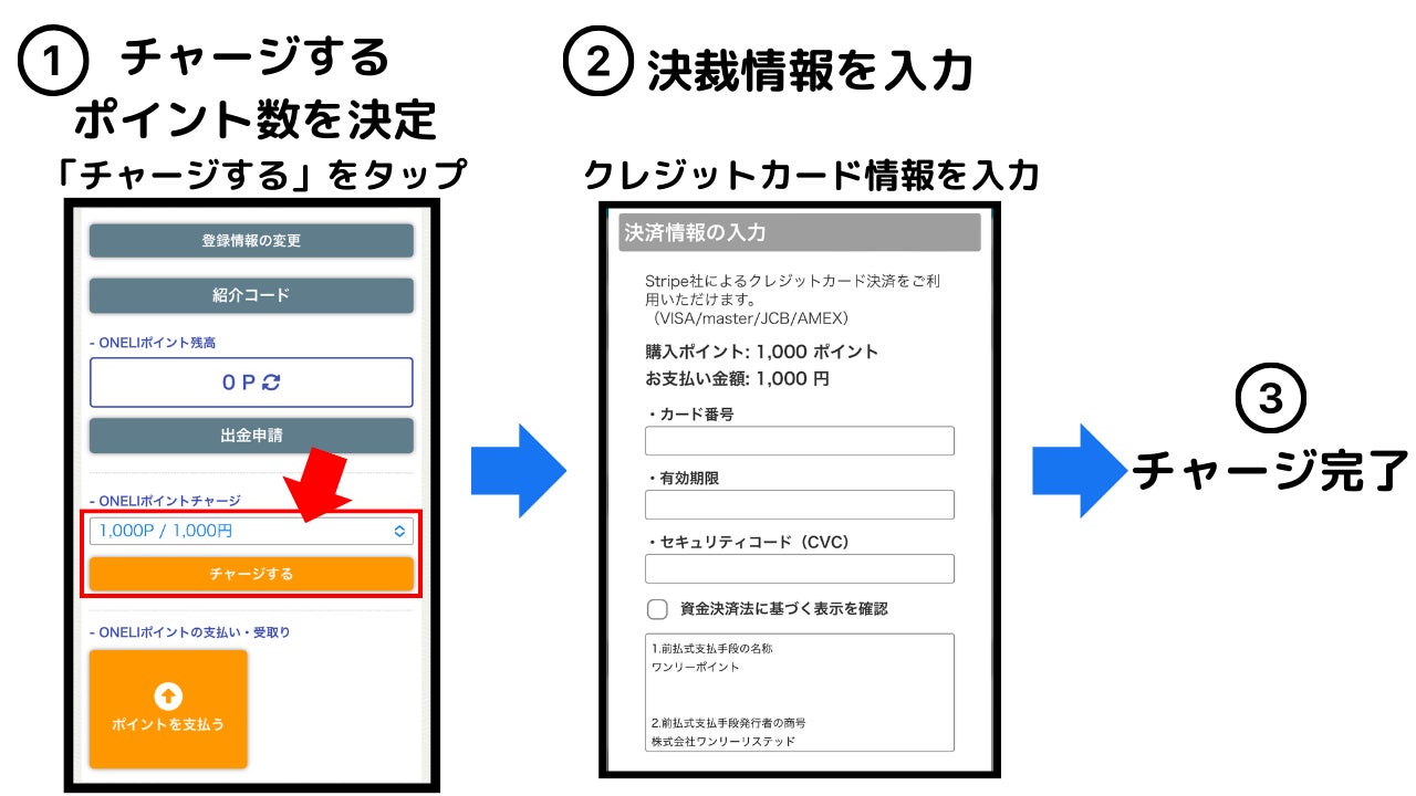 クレジットカードでポイントチャージすることができ、貯めたポイントと合算して「ONELI PAY」決済に利用できます。(1ポイント=1円)