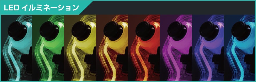 クリアブラックのボディ内部のLEDネオンチューブが、8種のパターンに変色しながら流れるように発光。ゲームシーンを盛り上げます。背面のLEDボタンを押すと、光り方を好きな色に固定したり、発光をオフにしたりすることもできます。