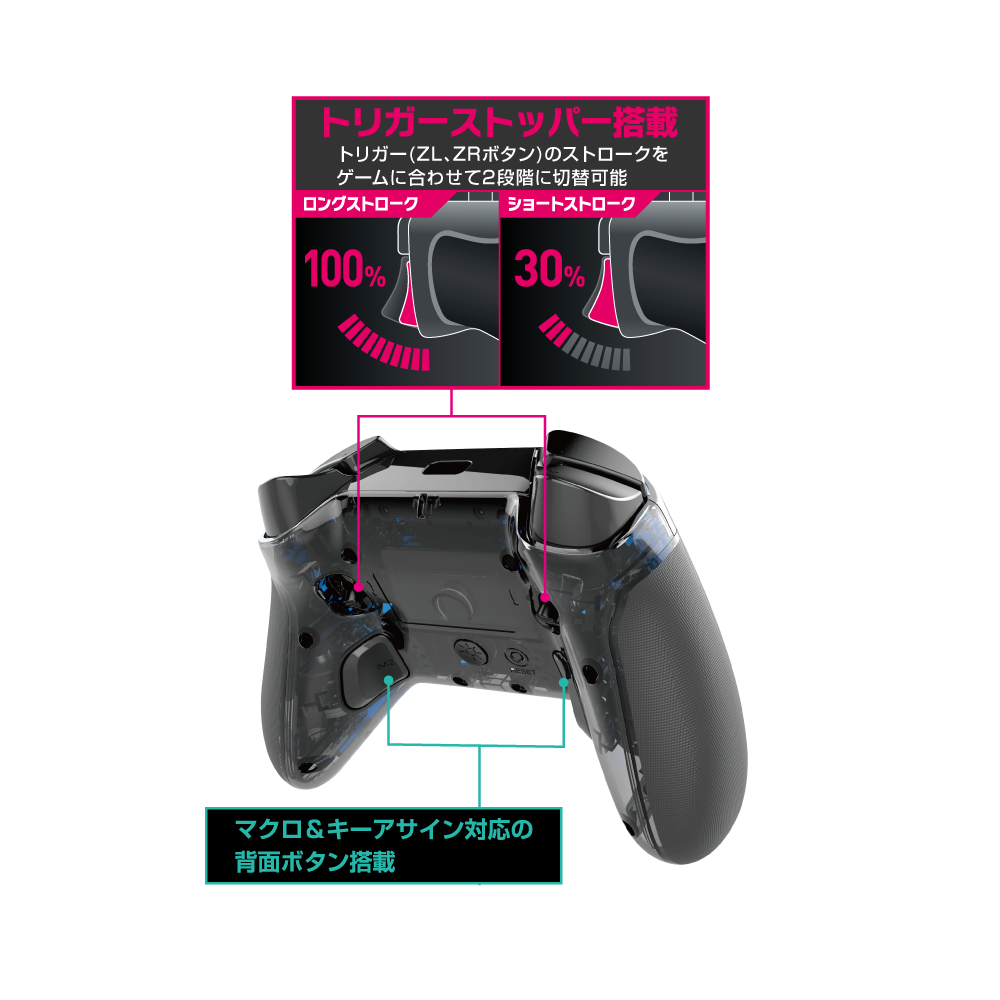 ZL/ZRボタンのストロークを二段階で切り替えできる『トリガーストッパー』と、好きなボタンをアサイン可能な背⾯ボタンを搭載。さまざまなシチュエーションに応えるプロスペックコントローラー!