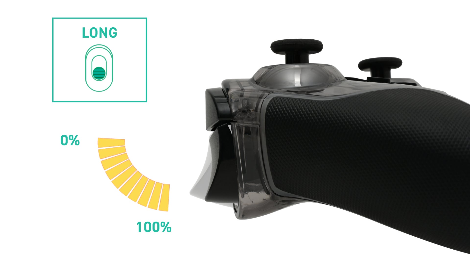 ZL/ZRボタンには、トリガーストロークを30%(浅め)と100%(深め)の二段階で切り替えができる、トリガーストッパー機能を搭載。プレイするゲームに応じて、適切なストロークに調整することができます。