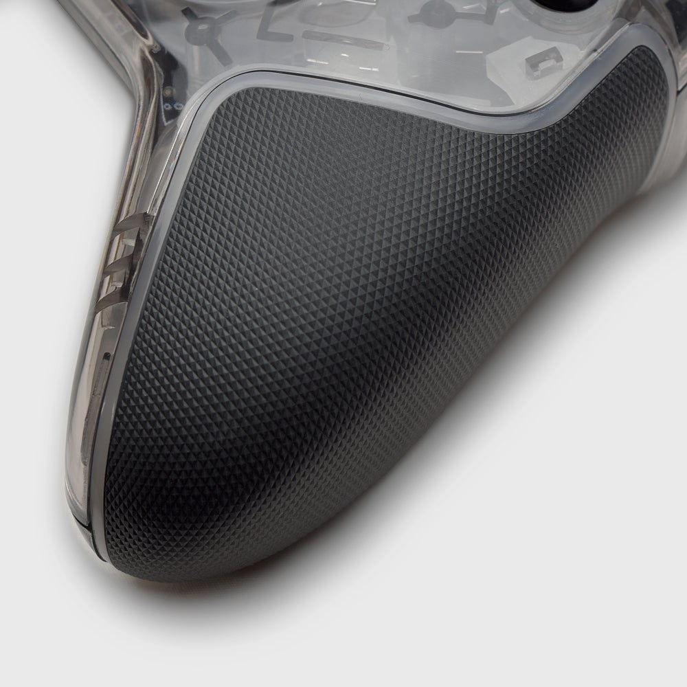 グリップ部分には握りやすい滑りにくいエンボスラバー加工が施されており、白熱したゲームシーンでもしっかりとコントローラーをホールドできます。また全体の適度な重量配分で、安定した操作が可能です。