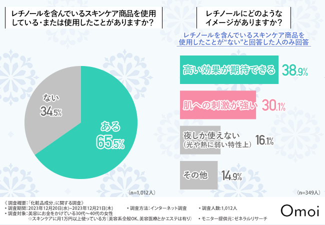 「レチノールを含んでいるスキンケア商品を使用している・または使用したことがありますか?」と質問したところ、約7割の方が『ある(65.5%)』と回答しました。