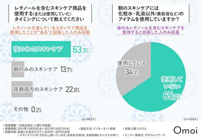 また、レチノールを含むスキンケア商品は光や熱に弱いとされているため、夜のみ使用している方が多いことも示されています。