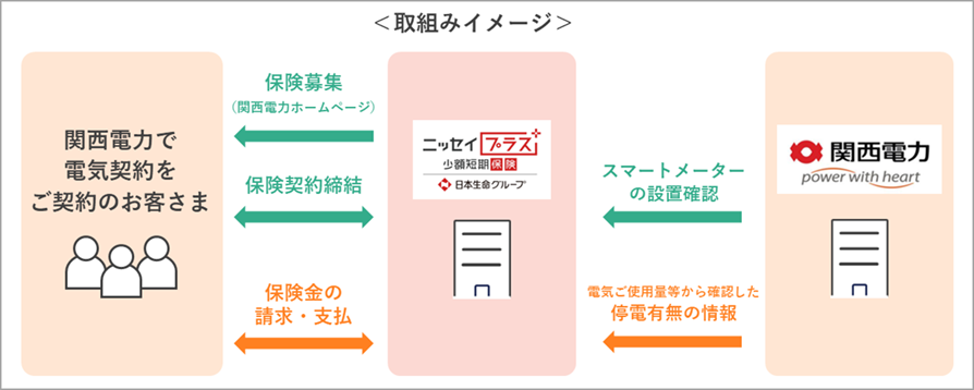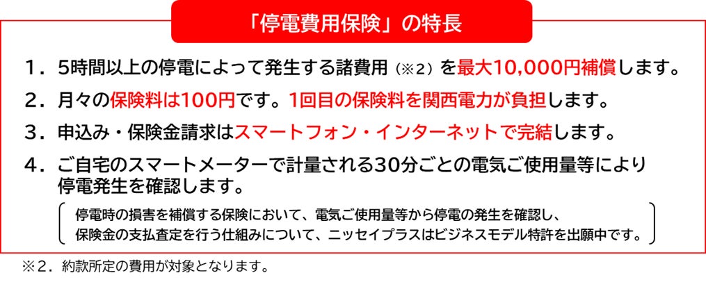 日本生命保険相互会社(代表取締役社長:清水博)の子会社であるニッセイプラス少額短期保険株式会社(代表取締役社長:光本正、以下「ニッセイプラス」)は、関西電力株式会社(取締役代表執行役社長:森望、以下「関西電力」)と協業して、本日から「停電費用保険」(以下「当商品」)の販売を開始しました。