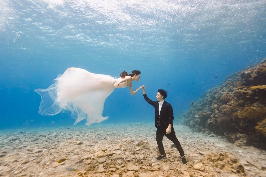 本プランは、水中撮影のプロフェッショナルであるカメラマン・香川氏(Sirena Wedding)と、沖縄でフォトウェディング事業を展開し、水中アテンドを行う山本氏(blanche beach)とのコラボレーションプランで、日本で初めて水深3~4Mという深場での撮影を可能にしたプランです。通常の水中ウェディングフォトは浅瀬での撮影が一般的ですが、お客様からの強い要望を受け、ダイビングショップと連携することで実現しました。