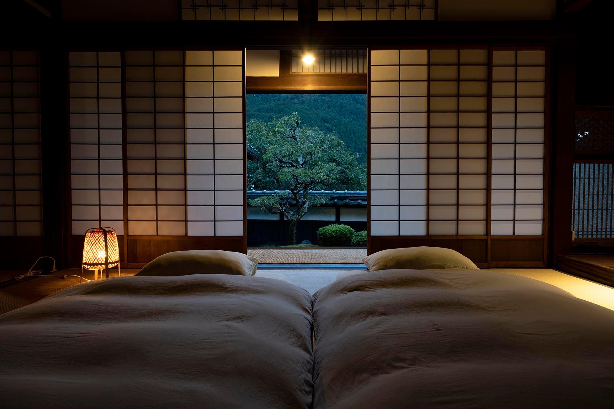 <夜は京都産の和晒しガーゼのふわふわリネンに包まれてお休みください。>