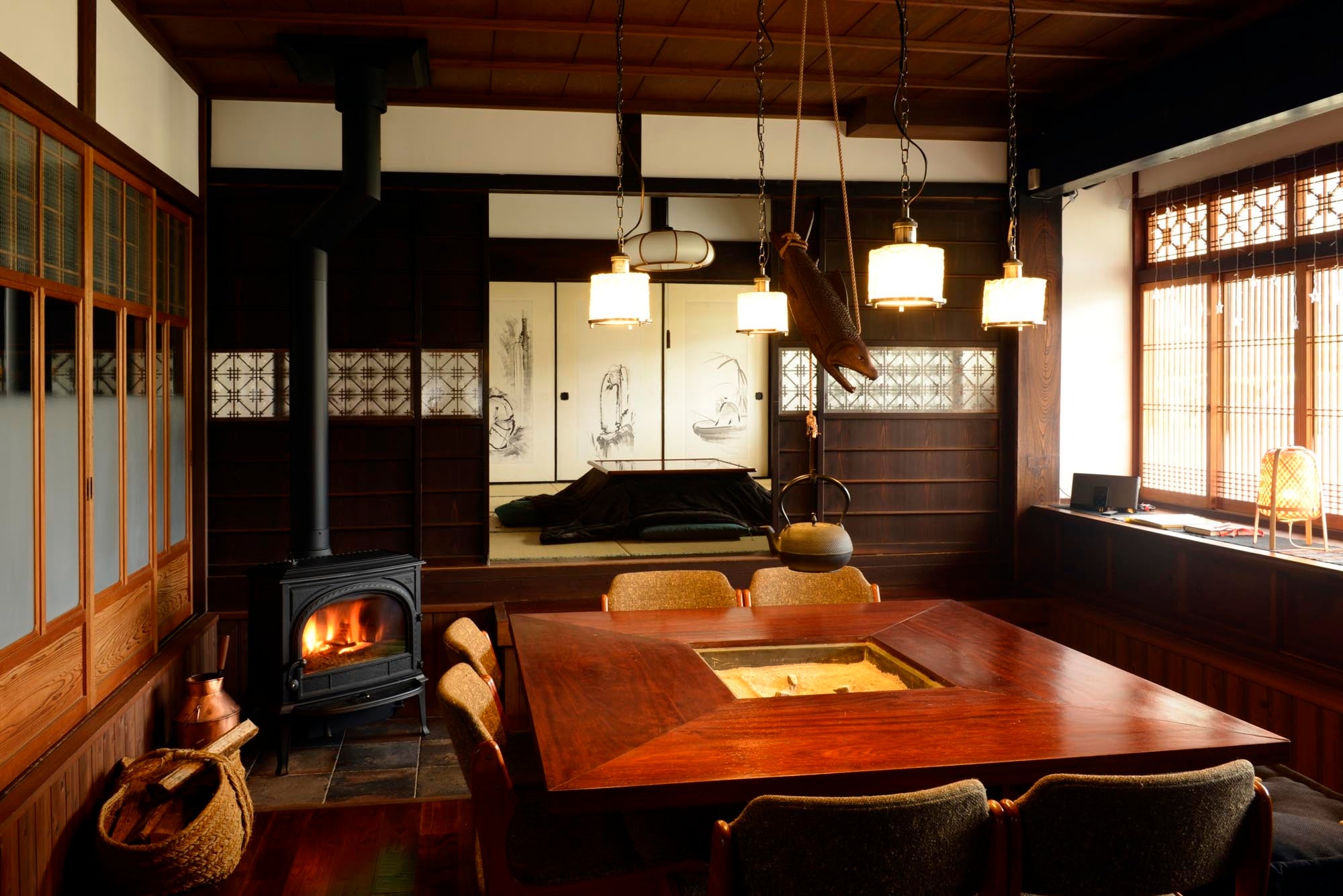 <ご夕食はワインが似合う囲炉裏テーブルのダイニングルームでお召し上がりください。>