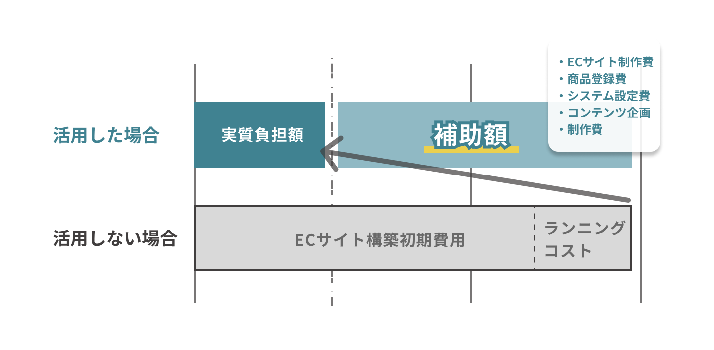 補助額が50万円以下までは補助率が3/4以内、50万円~350万円までは補助率が2/3以内となります。ECサイトの構築にIT導入補助金を利用する場合、補助の対象となるものは「ECサイトの構築費」とおよび「ASP(ショッピングカート)の利用料2年分」です。