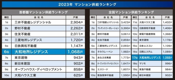 また2023年は、首都圏において1,068戸のマンションを発売し、新築分譲マンション供給ランキングで第6位となりました。