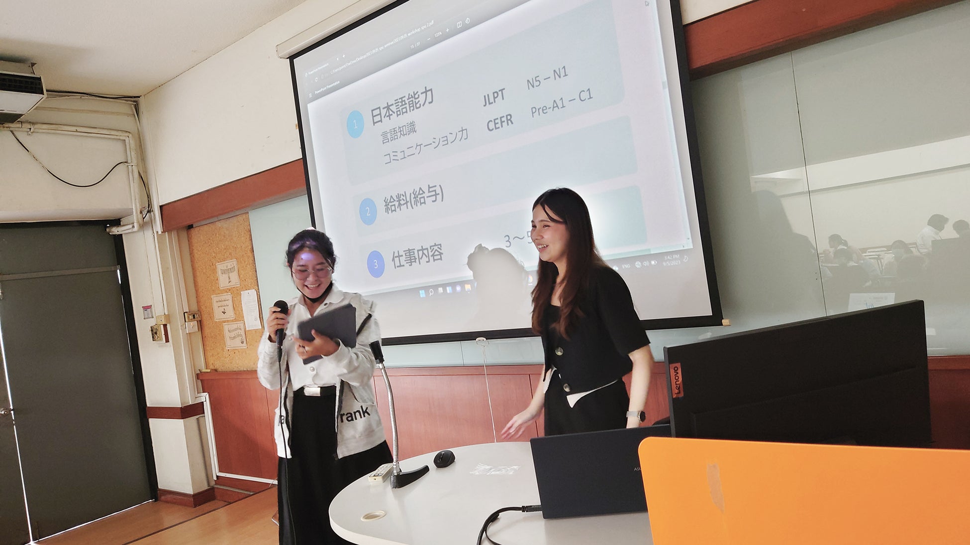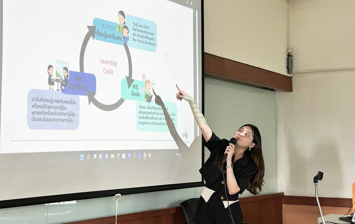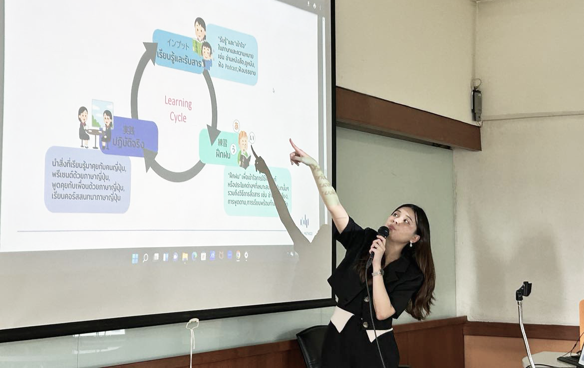 これまでのオンライン教育をベースとした実績をふまえ、SPUはバベルメソッド社に正課カリキュラムのなかで講義を行うことを依頼。2023年9月5日、バベルメソッド社タイ事業担当・ポーンティップ チンウォララッタナカノックが「日系企業で働くための日本語力」というテーマでワークショップ型の授業を行いました。55名の学生は、在タイ日系企業への就職で求められる日本語力や収入・待遇などについての情報を聞いた後にさらに自分たちで調査し、その結果から目標を立てて、これからの日本語学習をどう進めていくべきかを話し合いました。