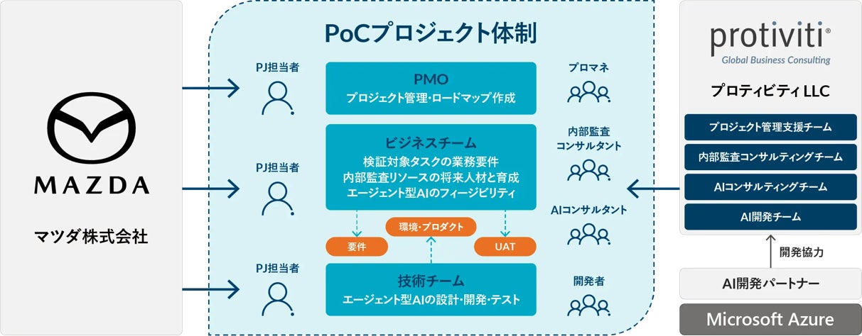 グローバルコンサルティングファームであるProtiviti Inc.(プロティビティ・インク)の日本法人であるプロティビティ LLC(本社:東京都千代田区、日本共同代表:藤原史人・吉田真樹、以下「プロティビティ」)は、2025年12月22日(月)より、日本マイクロソフト株式会社の技術協力のもと、マツダ株式会社と共同で、AIエージェントが自律的に業務を遂行するAI時代の内部監査の実現に必要なインフラ、プロセス、リソースを検証・考察する共同実証実験(PoC)を開始します。本取り組みでは、AI活用で得られる価値を最大限に引き出すことで、迅速かつ的確なリスク予測、戦略的・付加価値の高い提言を行う内部監査機能を実現し、組織体が企業価値を創造・保全・維持する能力を高めることに貢献します。