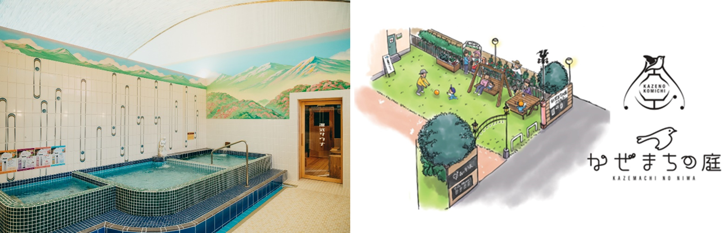本事業では「デイサービス ときの森」に、2024年4月、併設オープンした地域住民が集うコミュニティースペース「かぜまちのにわ」を活用し、保護者が子どもを安全に預けることができる一方で、近隣の銭湯「御所宝湯」と連携し、子どもを預ける間、パパ・ママは銭湯&サウナで心身を癒し過ごしていただくことができます。