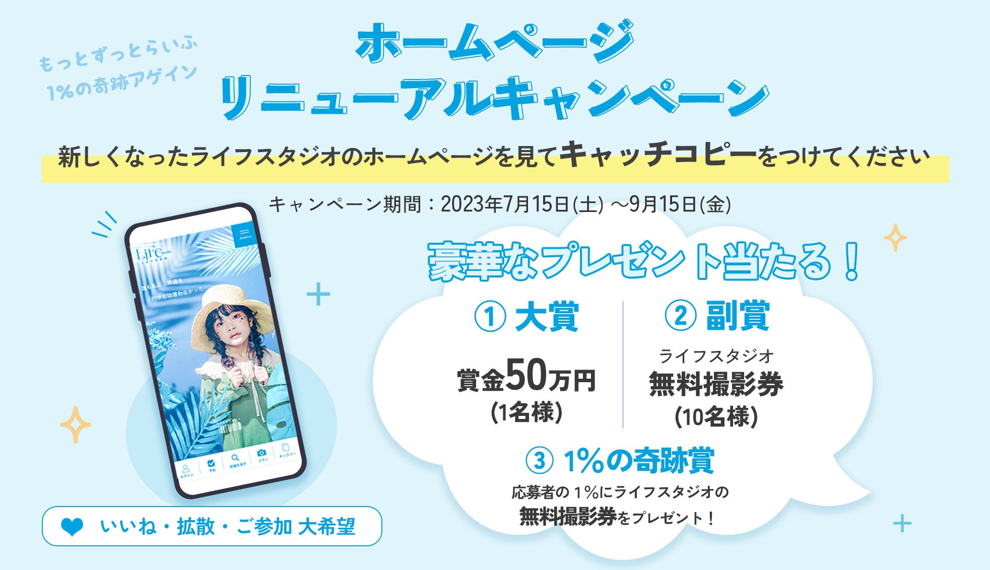 今回のHPリニューアルキャンペーンは今までの感謝も込めて、キャッチコピー応募で「1%の奇跡賞」100人に1人ライフスタジオ無料撮影券が当たります。