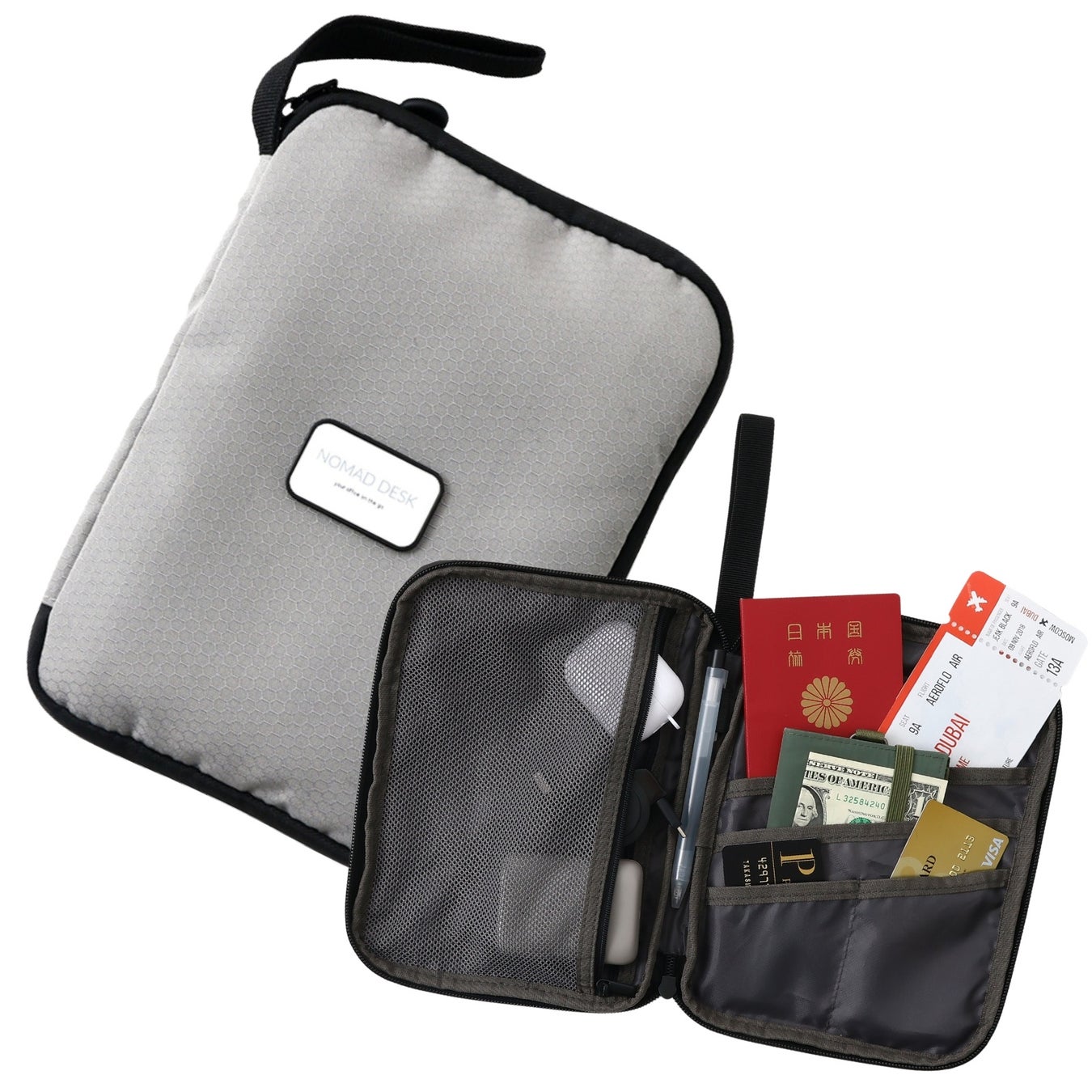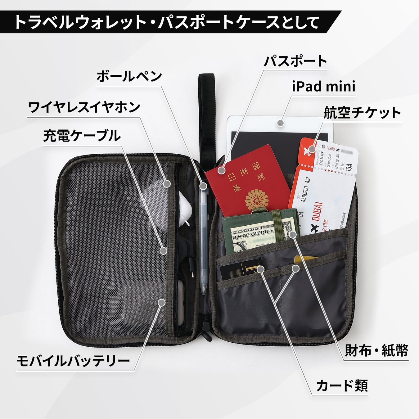 パスポートや航空チケット・乗車券/特急券のほか、ipad miniなど8.3インチ以下の小型タブレット、モバイルバッテリー、ワイヤレスイヤホン、充電ケーブル、小さめな財布、カード類など移動中に必要なモノだけ収納。