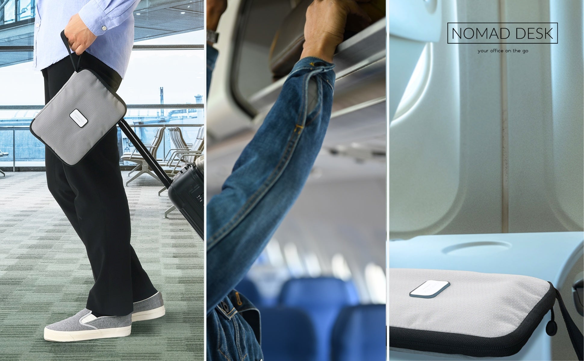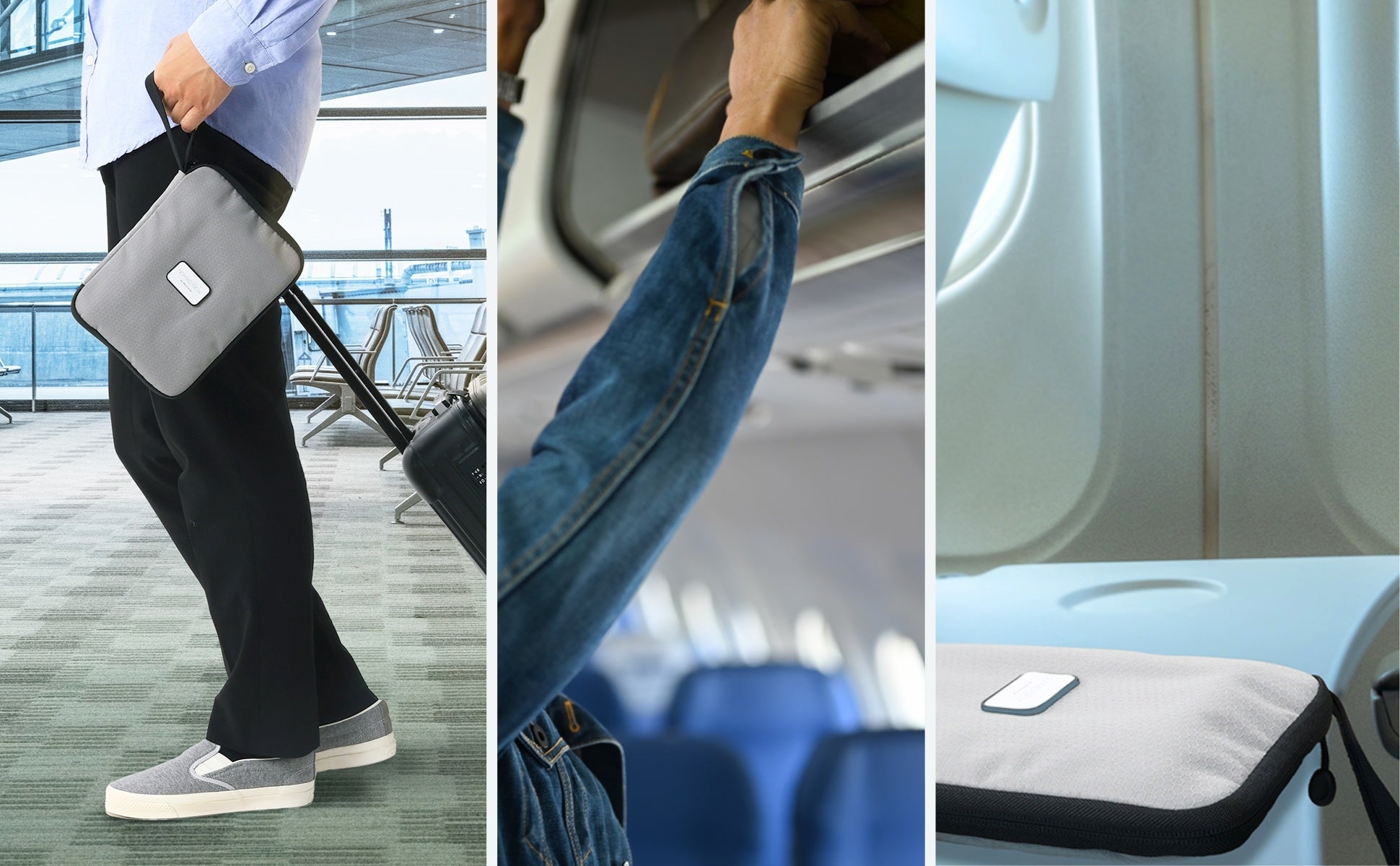 飛行機内や新幹線の座席でリュックやショルダーバッグなどは場所を取って案外困るもの。大きめの荷物を頭上の荷物棚・コンパートメントに収納して必要なモノだけ手元に置くスタイルに便利。