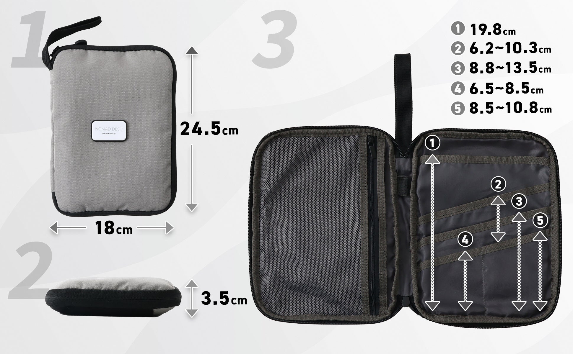 内部ポケットの深さ: ポケットは5つあり、それぞれの深さサイズは以下の通り。
