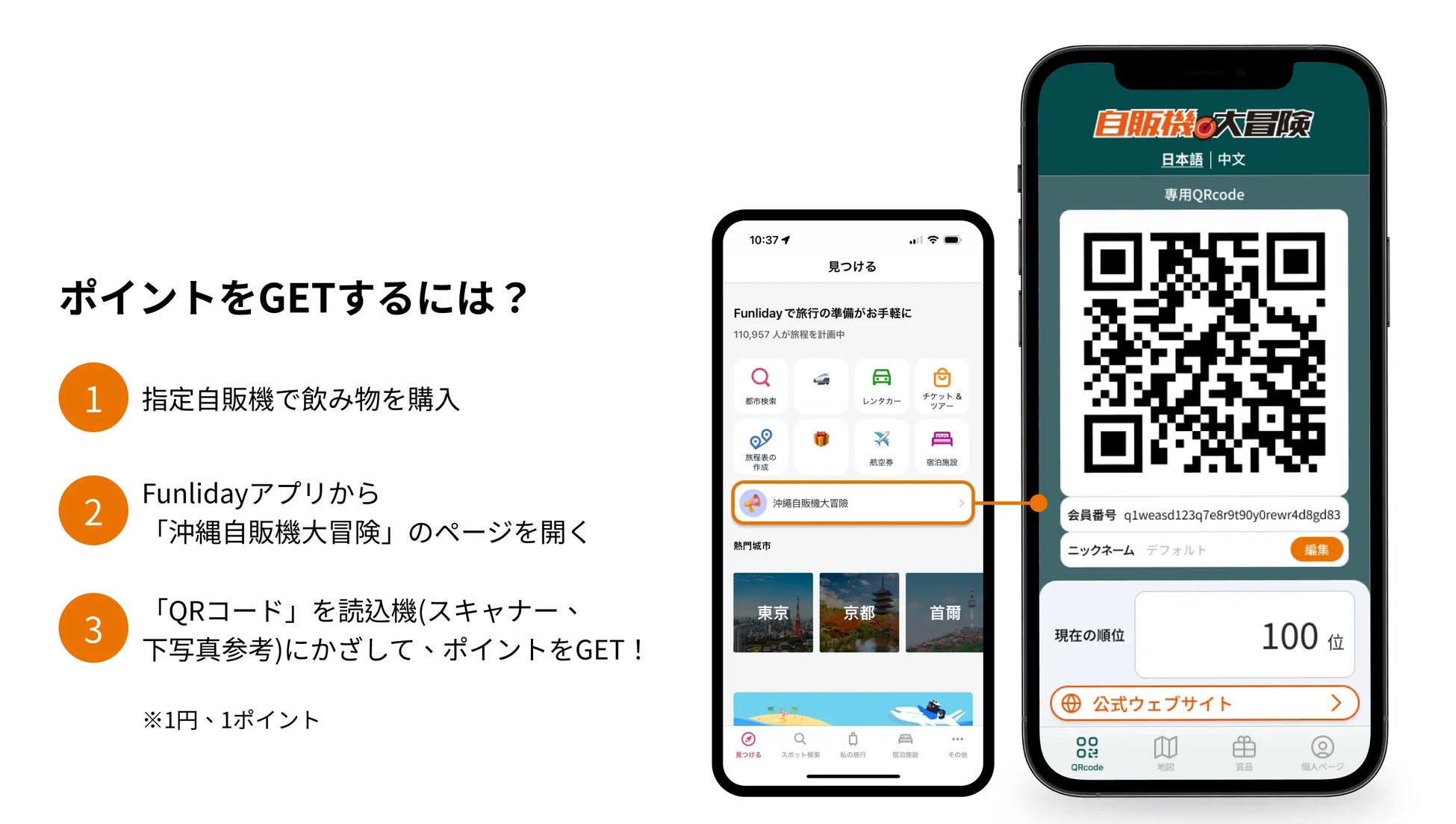 イベントに参加するには、Funliday, Inc.が提供する旅の計画アプリ「Funliday App」をダウンロードし、チェックインコードを生成します。その後、対象自動販売機でドリンクを購入し、生成されたQRコードをかざすことで、ポイントを獲得いただけます。